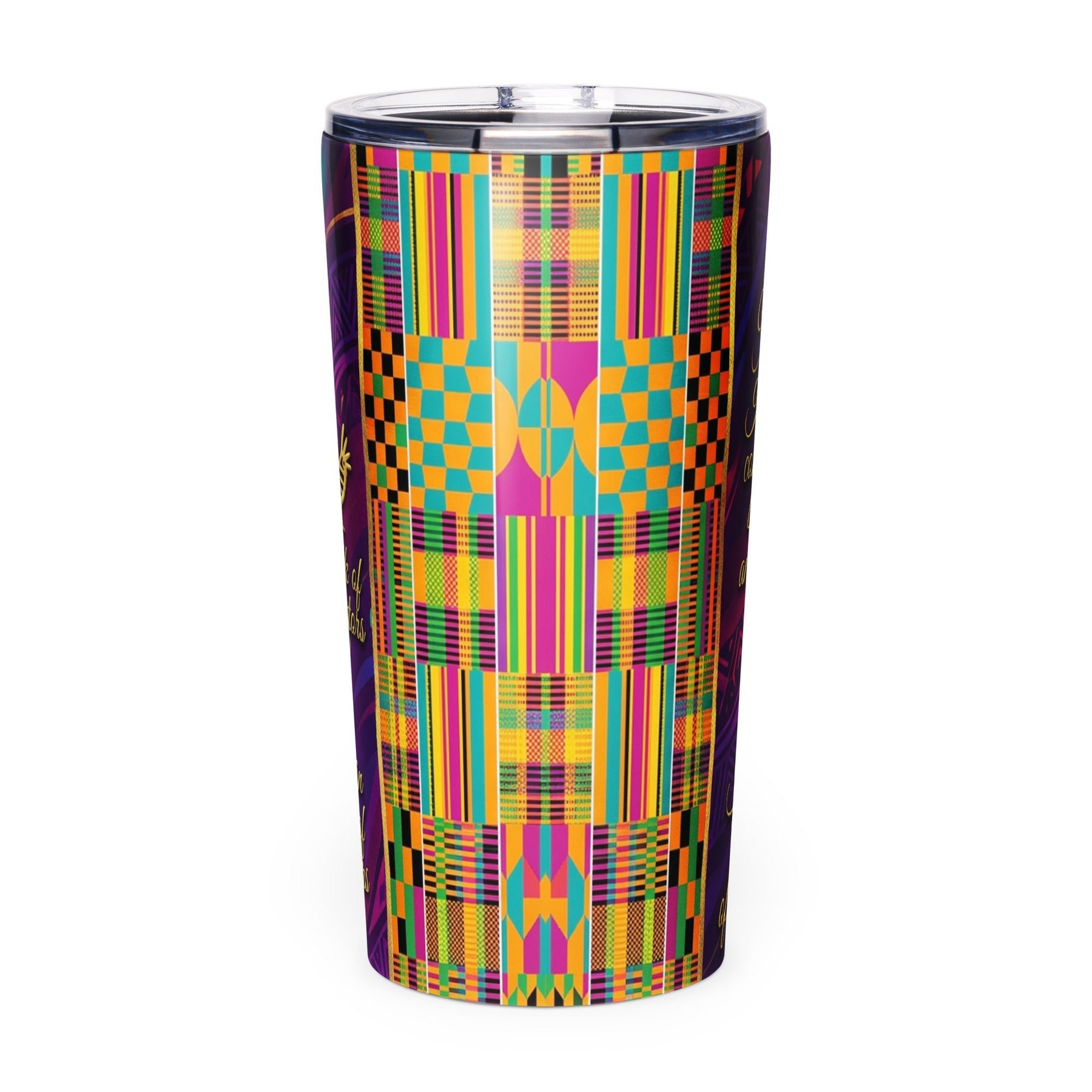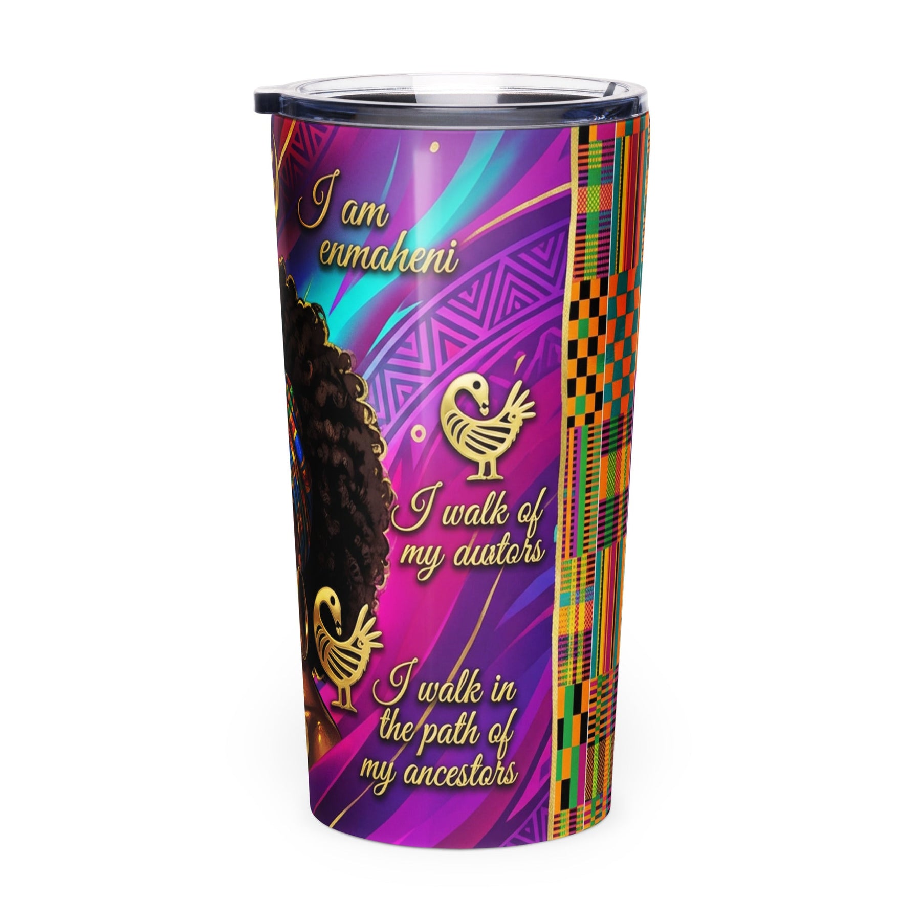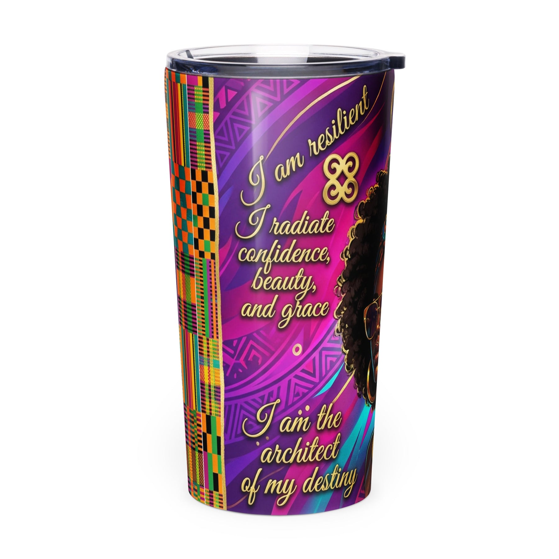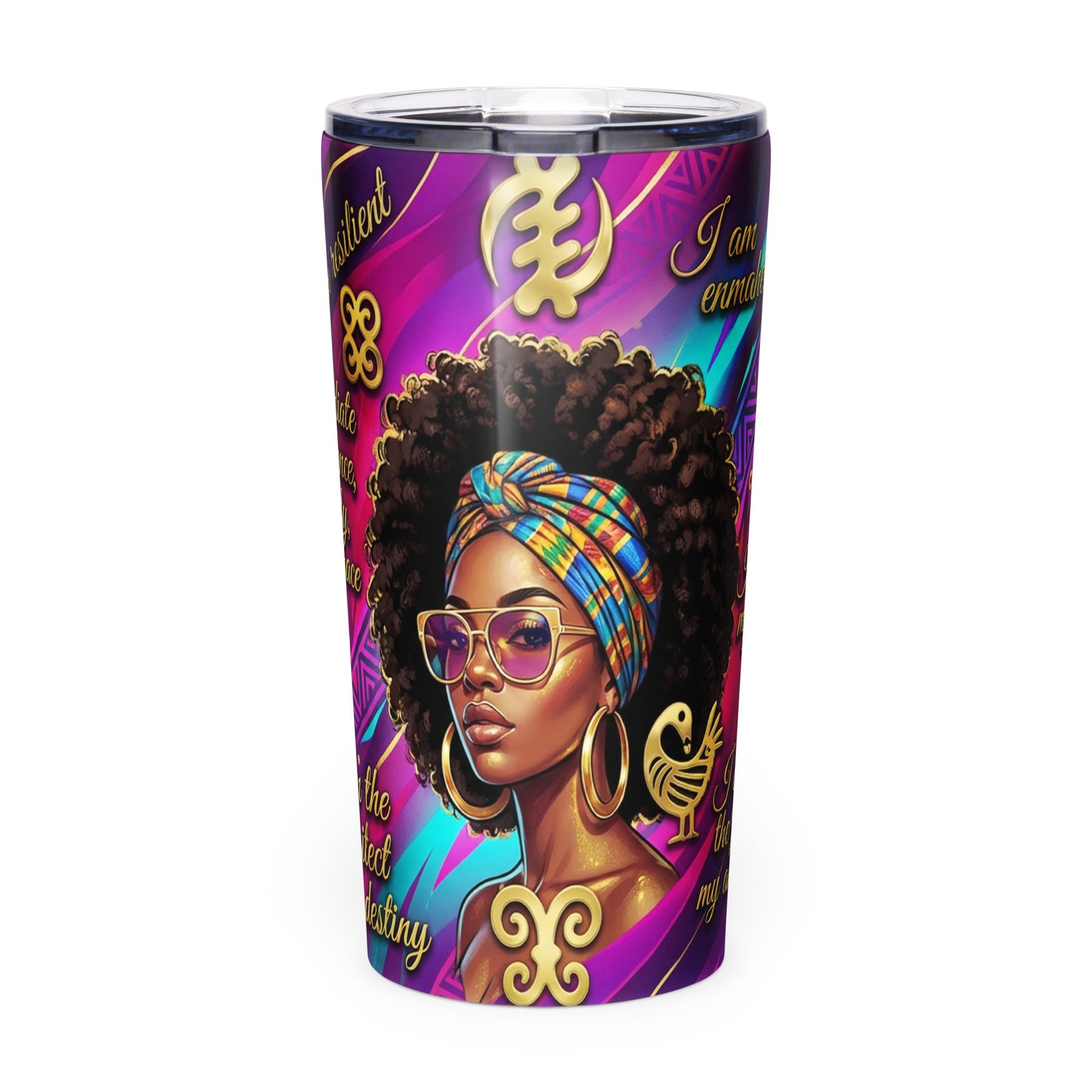 Celebrate your strength, beauty, and heritage every day with this stunning 20 oz. stainless steel tumbler designed specifically for Black women. This empowering tumbler features a vibrant wraparound design in rich purples, magentas, teals, and gold, adorned with authentic Adinkra symbols from Ghana and powerful affirmations that speak to the Black experience.