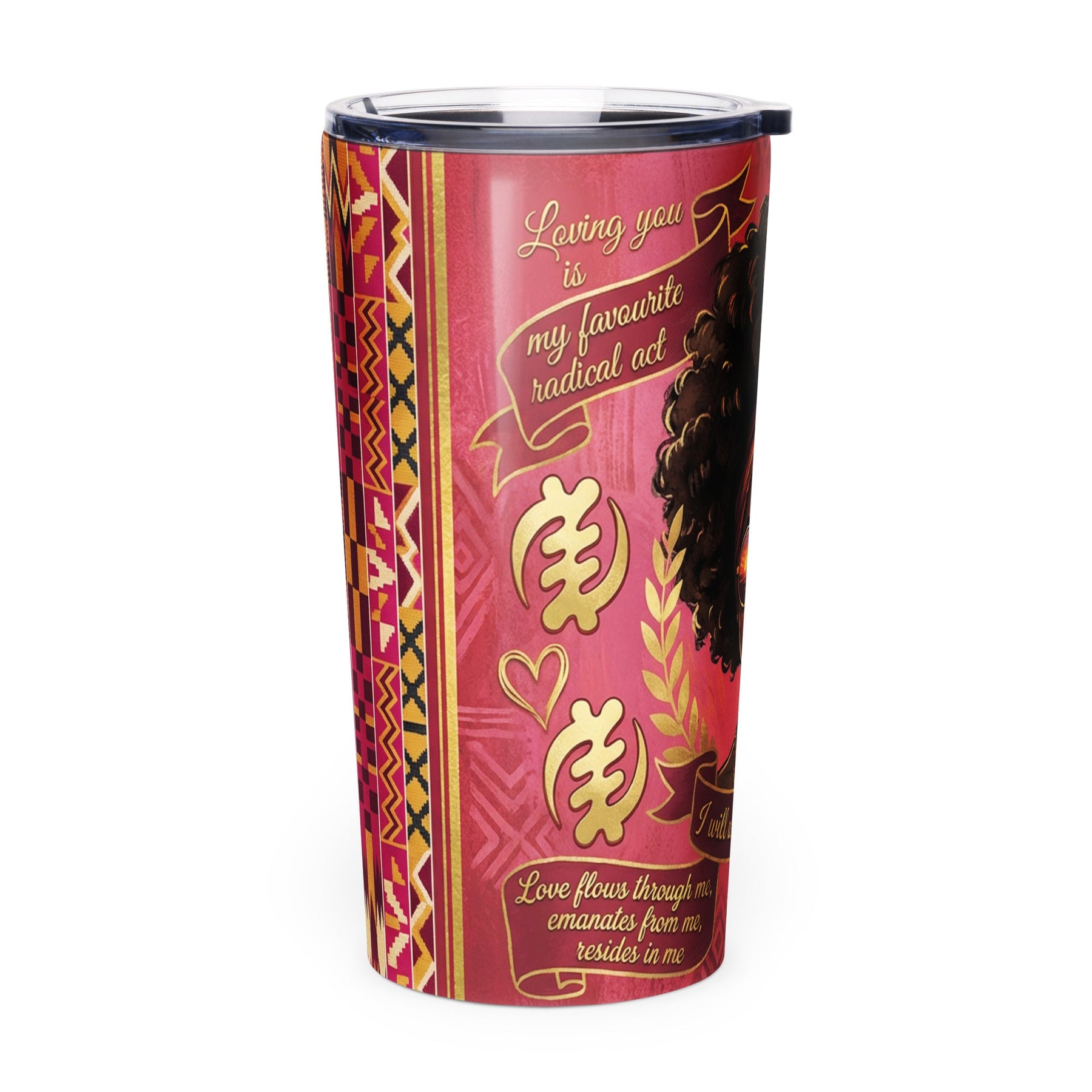 Featuring wisdom from June Jordan and other powerful voices, this tumbler reminds you that loving yourself is a radical act and your very life depends upon it. The authentic Adinkra symbols represent love and truth, while the seamless Kente cloth patterns embrace you like a warm hug from your ancestors.