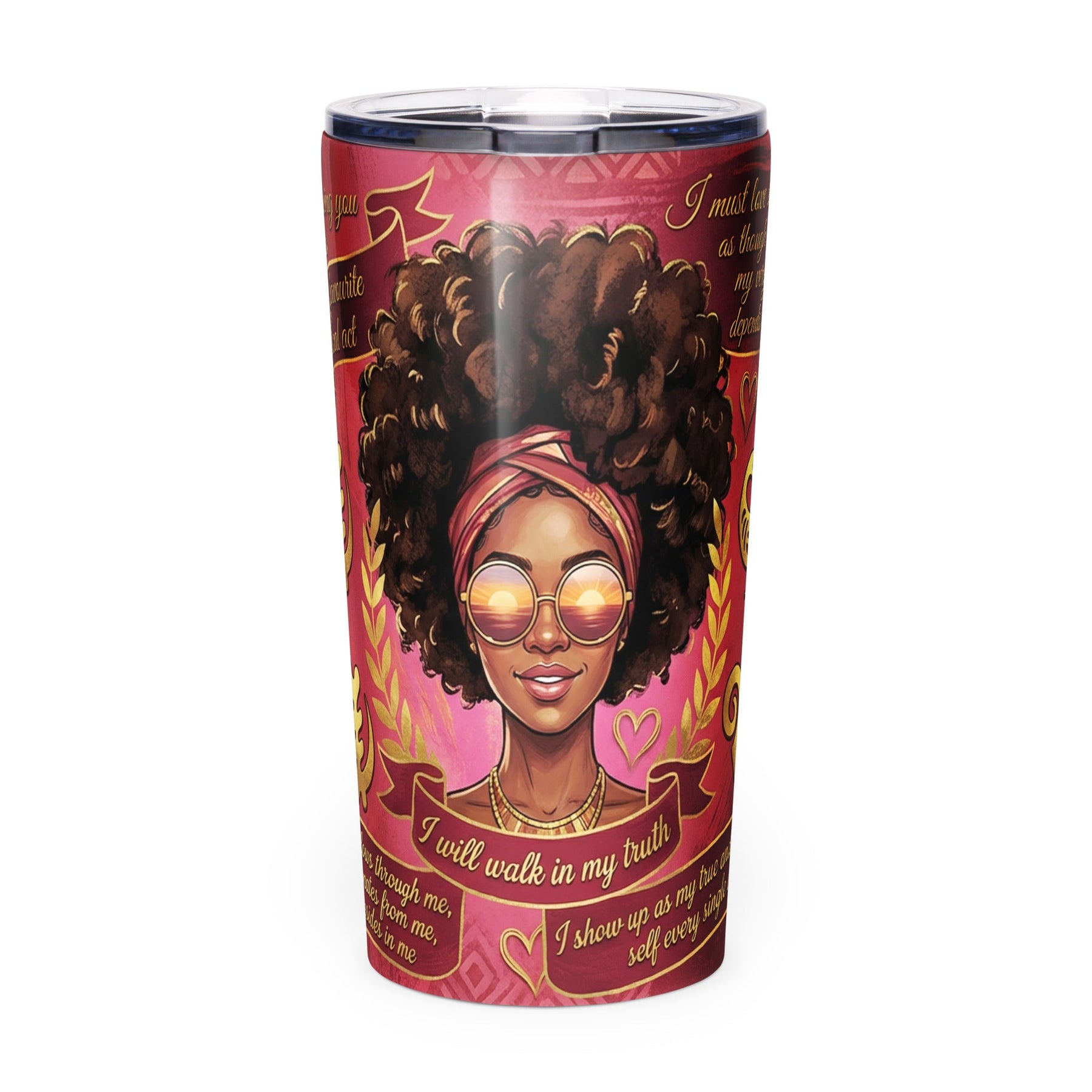 Honor yourself with radical self-love with the Sacred Love tumbler from the Crown & Confidence Collection. This warm design features deep red with pink and gold accents, creating an atmosphere of love and authenticity.
