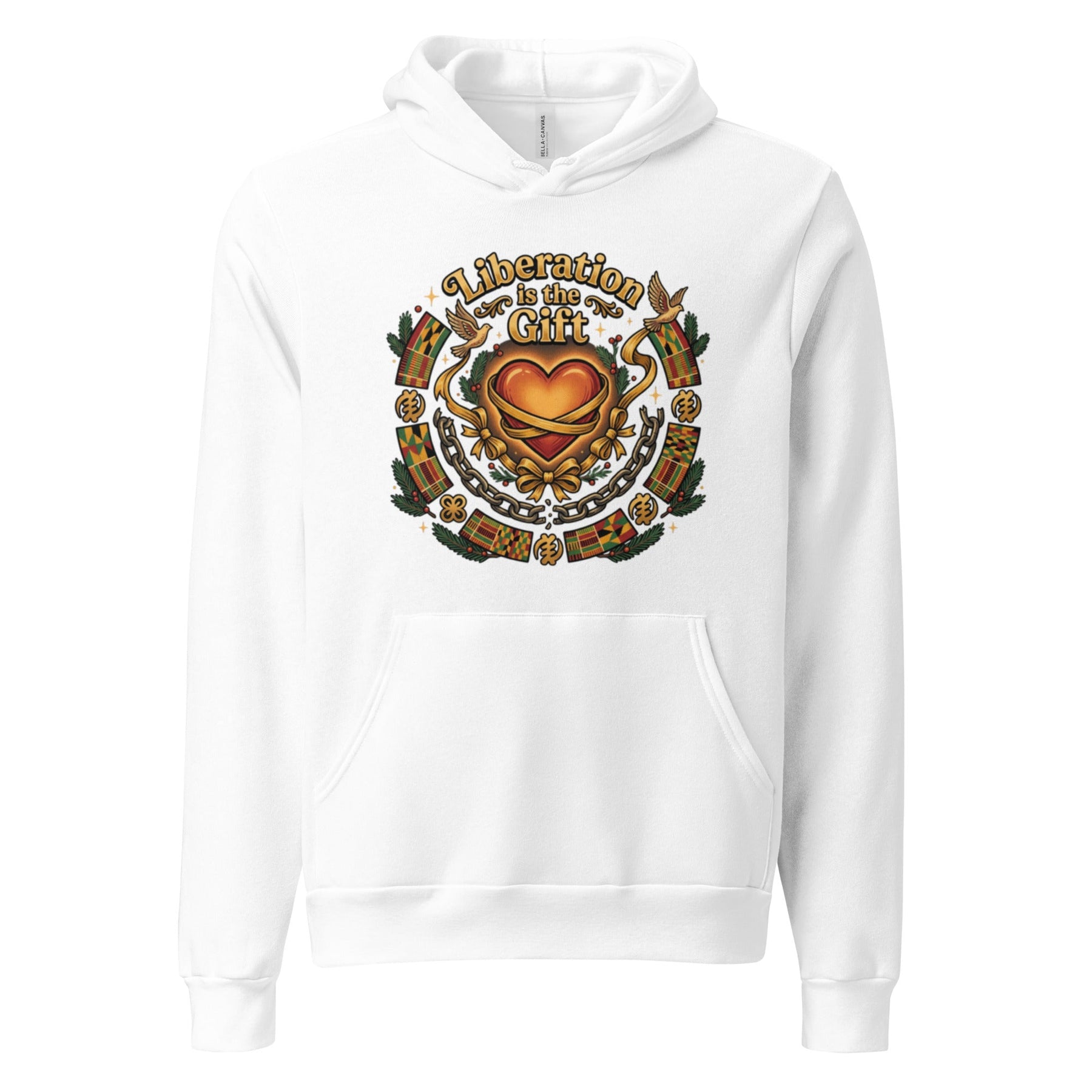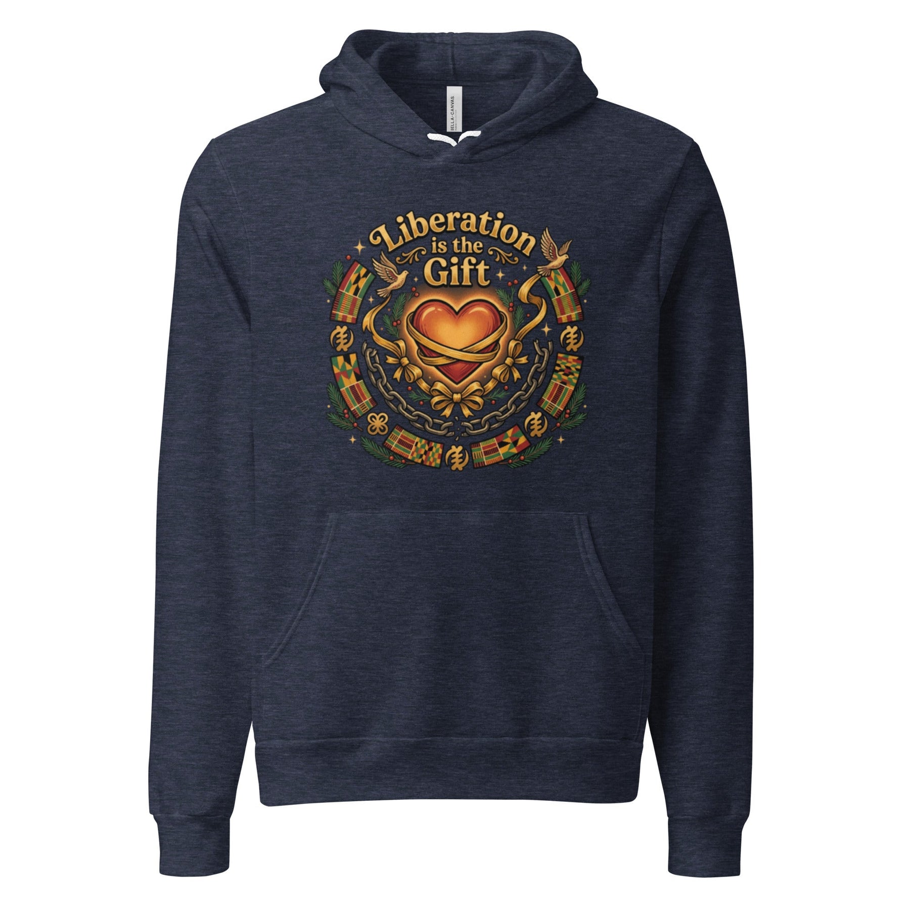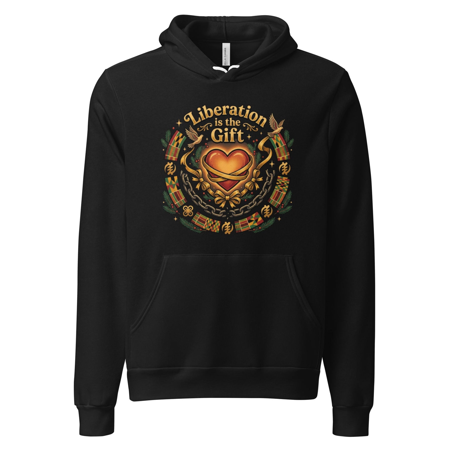 The text, "Liberation is the Gift," is bold and celebratory, rendered in gold with decorative flourishes that honor both the festive season and the revolutionary spirit.
