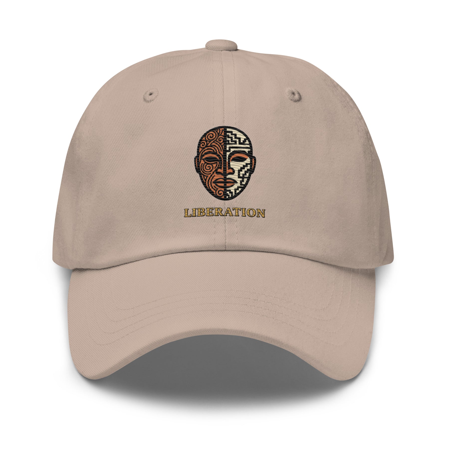 This embroidered hat features a breathtaking dual-pattern mask design that honors the sacred fusion of African and Indigenous heritage. One side of the mask flows with terracotta swirls and spirals—echoing the ancient artistic traditions of West African ancestors. The other side is adorned with cream geometric patterns and bold lines—paying homage to Indigenous wisdom, design, and resilience.