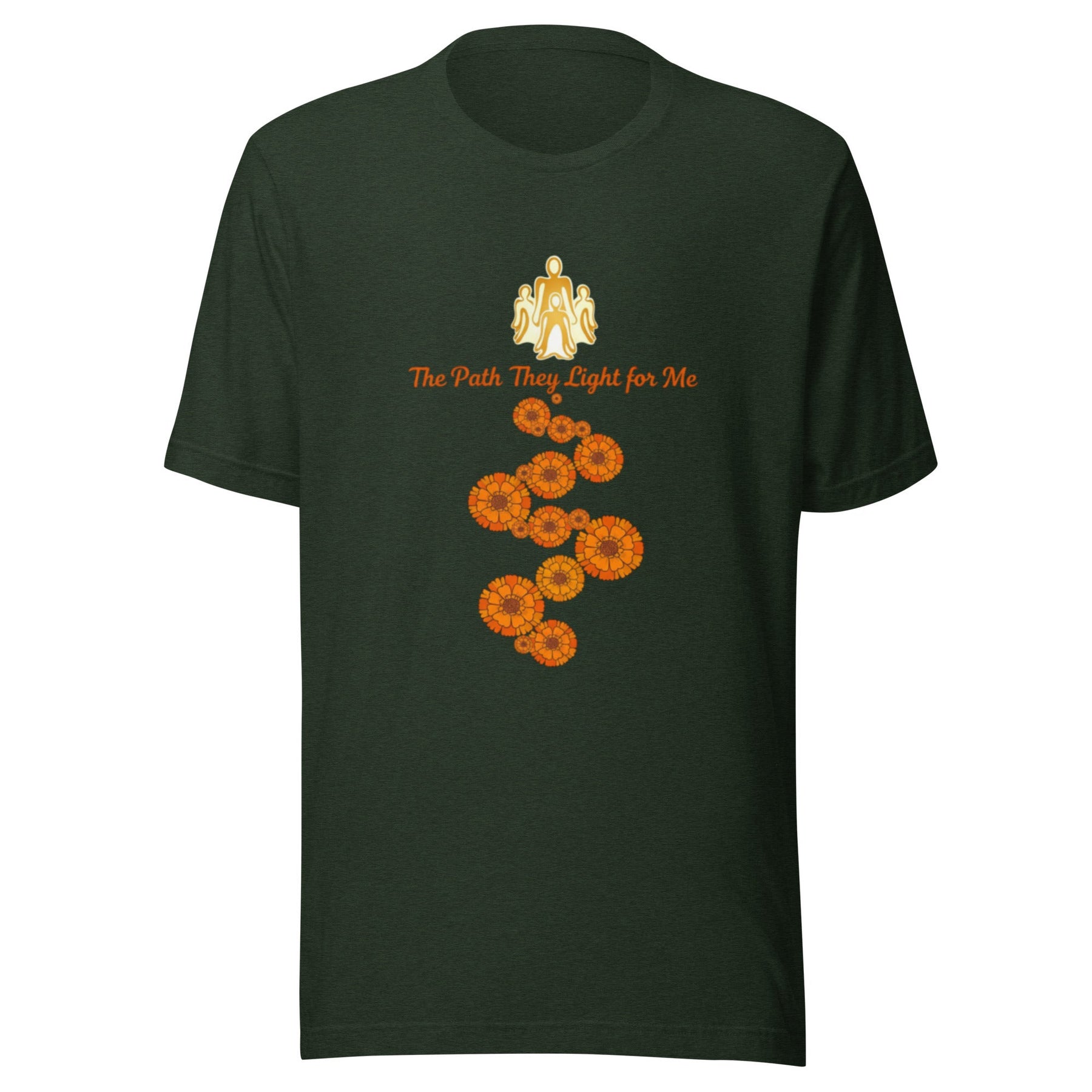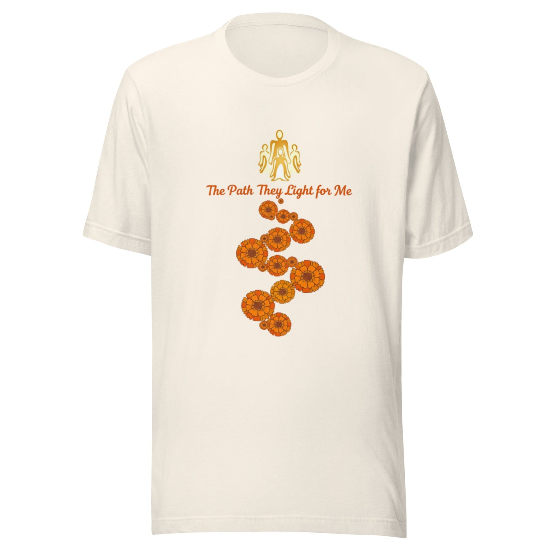 This design beautifully merges these two traditions, featuring glowing ancestor silhouettes at the top—representing the spirits watching over us—and a winding path of vibrant orange marigolds below, symbolizing the way they light for us. The phrase “The Path They Light for Me” is a personal declaration of gratitude and recognition: I am not walking alone. My ancestors are with me, showing me the way.