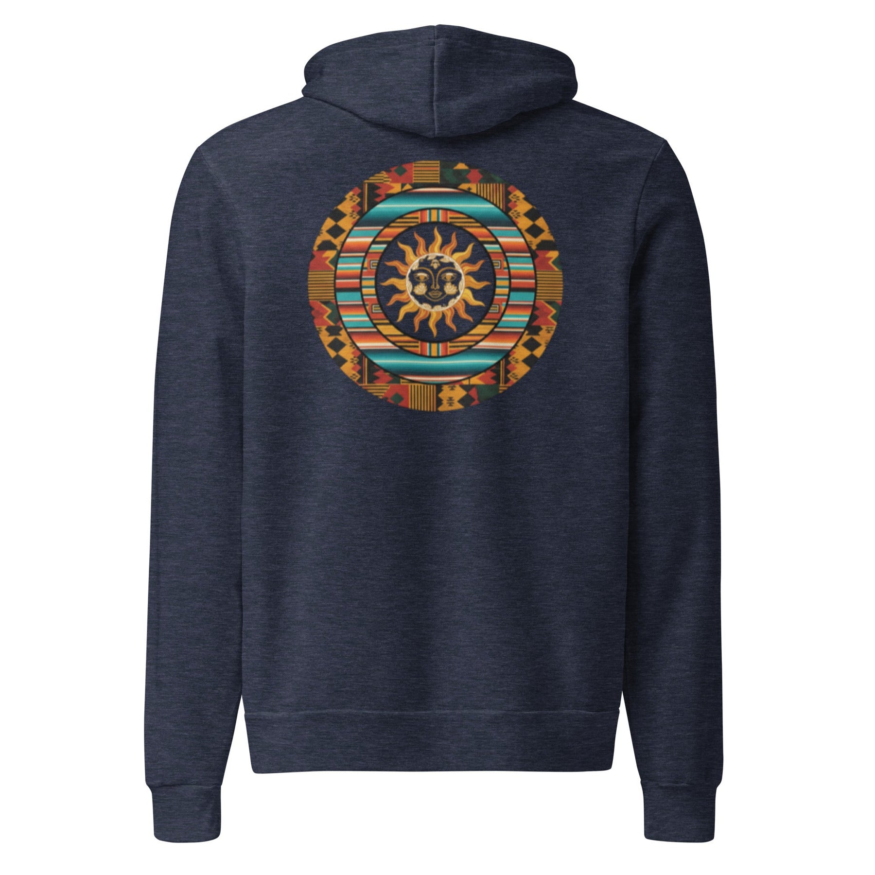 A stylized sacred heart, a powerful symbol in Mexican folk art, rendered in bold red and gold. The heart is engulfed in flames, and at its center, it contains a fusion of African and Mexican symbols (e.g., an Adinkra symbol and a milagro charm). The phrase “Hecho con Fuego y Alma” (Made with Fire and Soul) is integrated into the design.