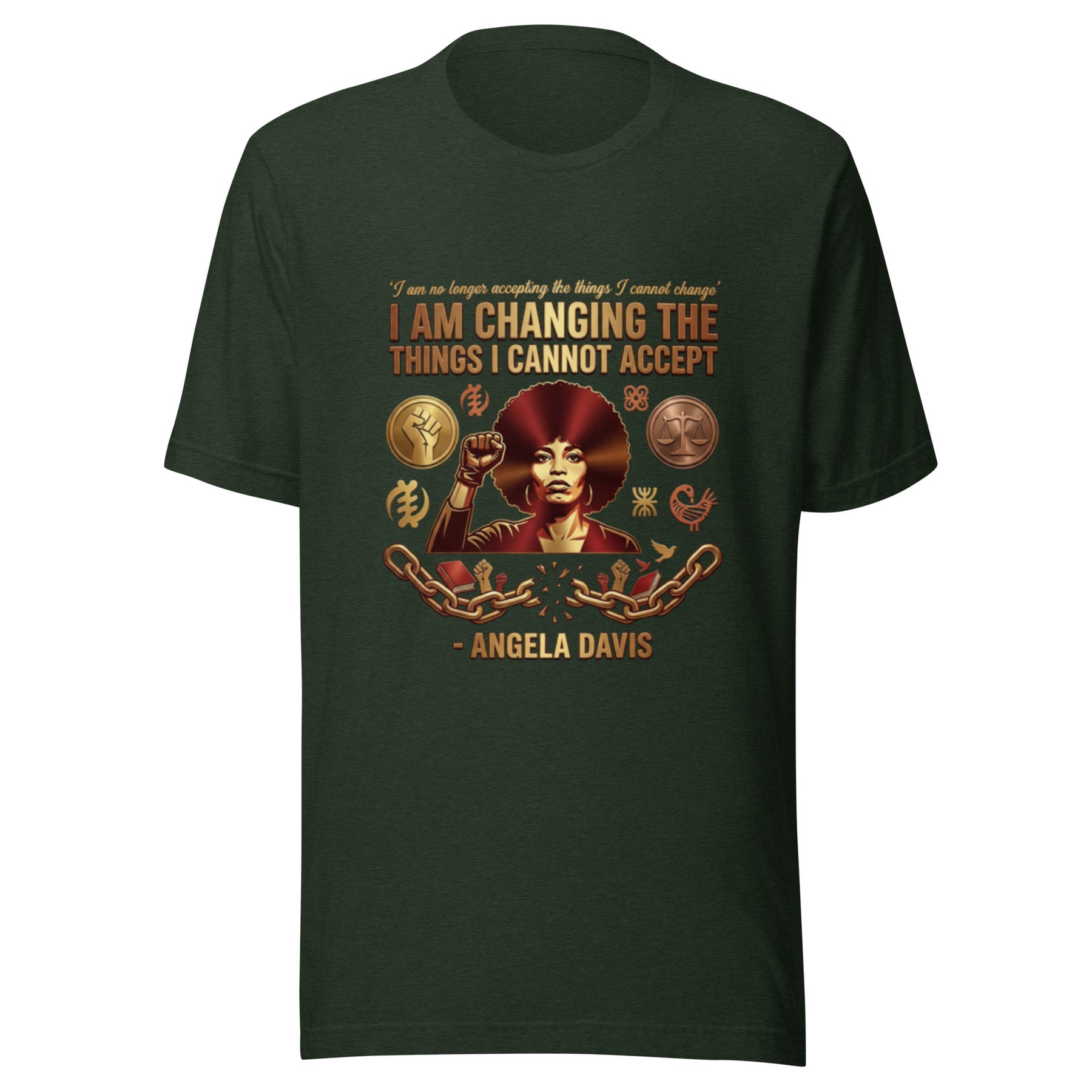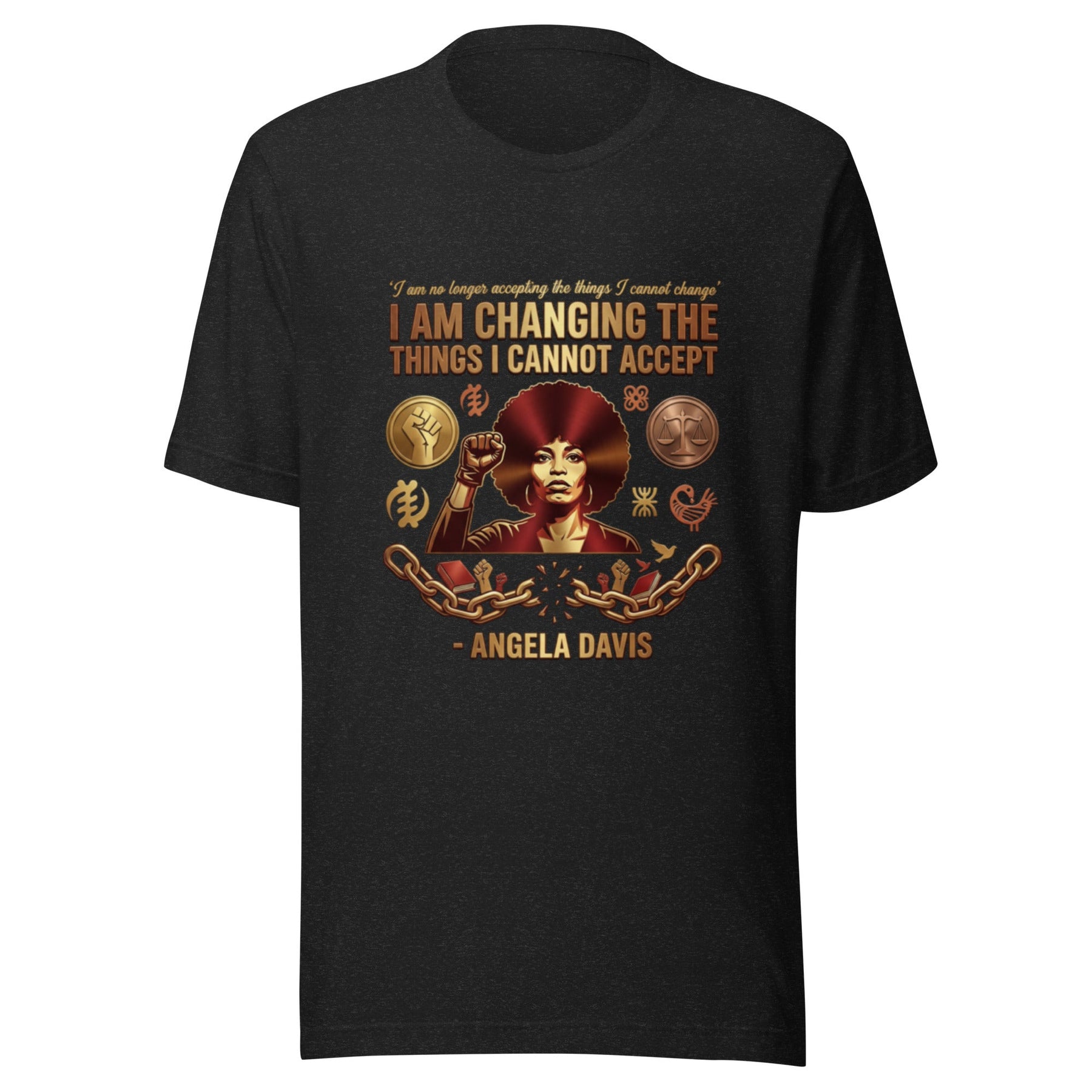 Channel the revolutionary spirit of Angela Davis, a living icon of liberation. This design features her powerful declaration: "I am no longer accepting the things I cannot change. I am changing the things I cannot accept." Her iconic afro and raised fist are symbols of Black Power and intellectual rigor. Wear this as a call to action, a commitment to not just critique the world, but to actively change it.
