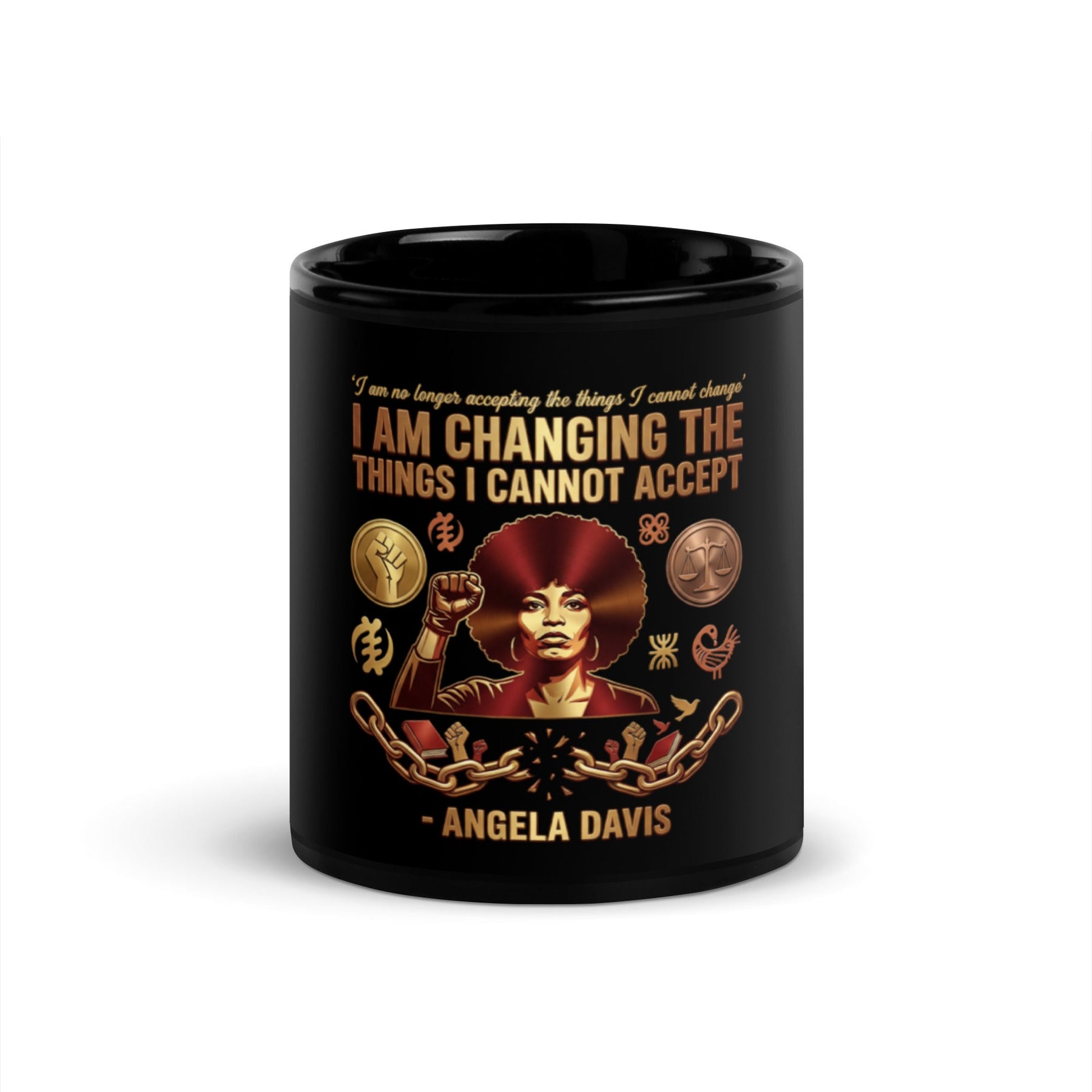 Channel the revolutionary spirit of Angela Davis, a living icon of liberation. This design features her powerful declaration: "I am no longer accepting the things I cannot change. I am changing the things I cannot accept." Her iconic afro and raised fist are symbols of Black Power and intellectual rigor. Use this as a call to action, a commitment to not just critique the world, but to actively change it.
