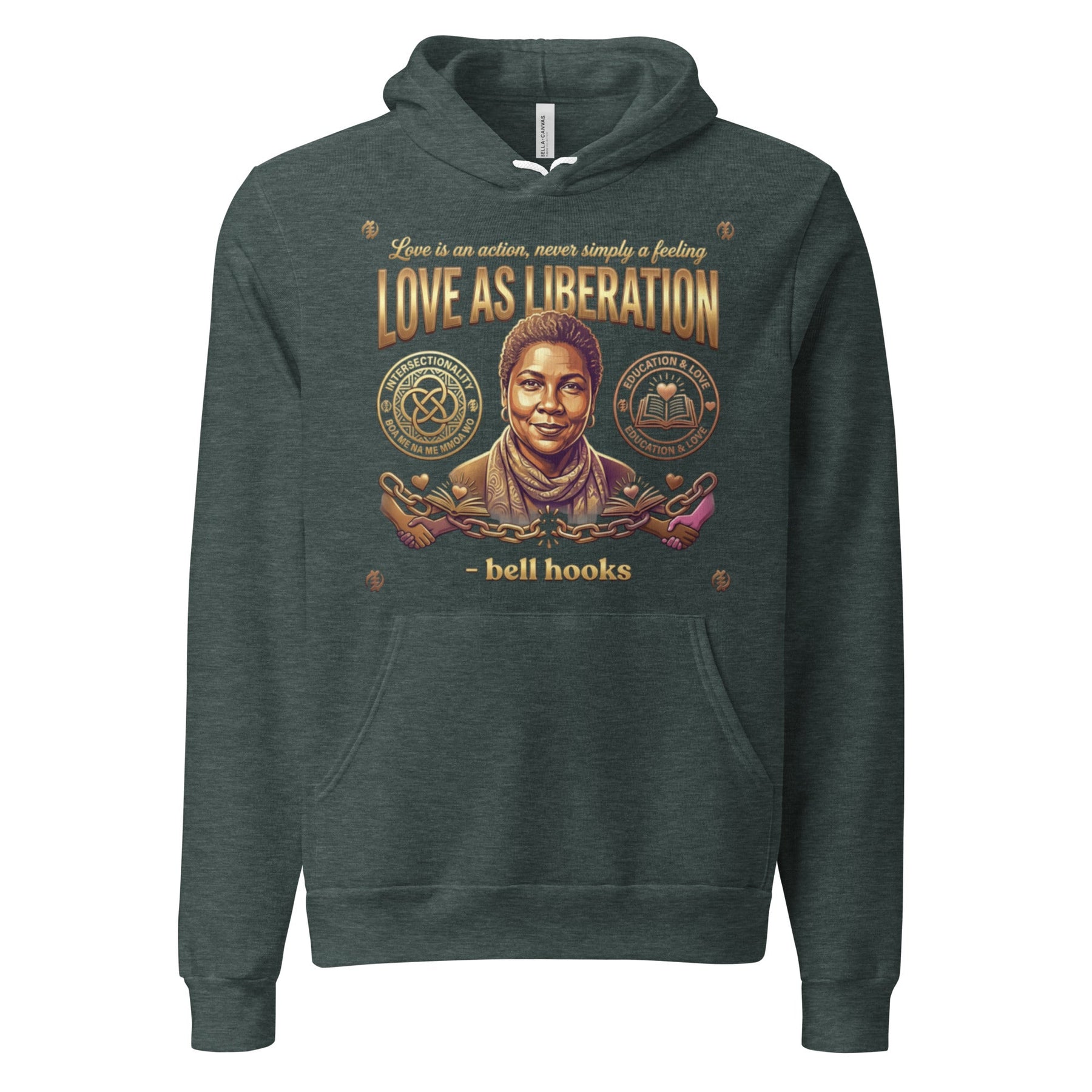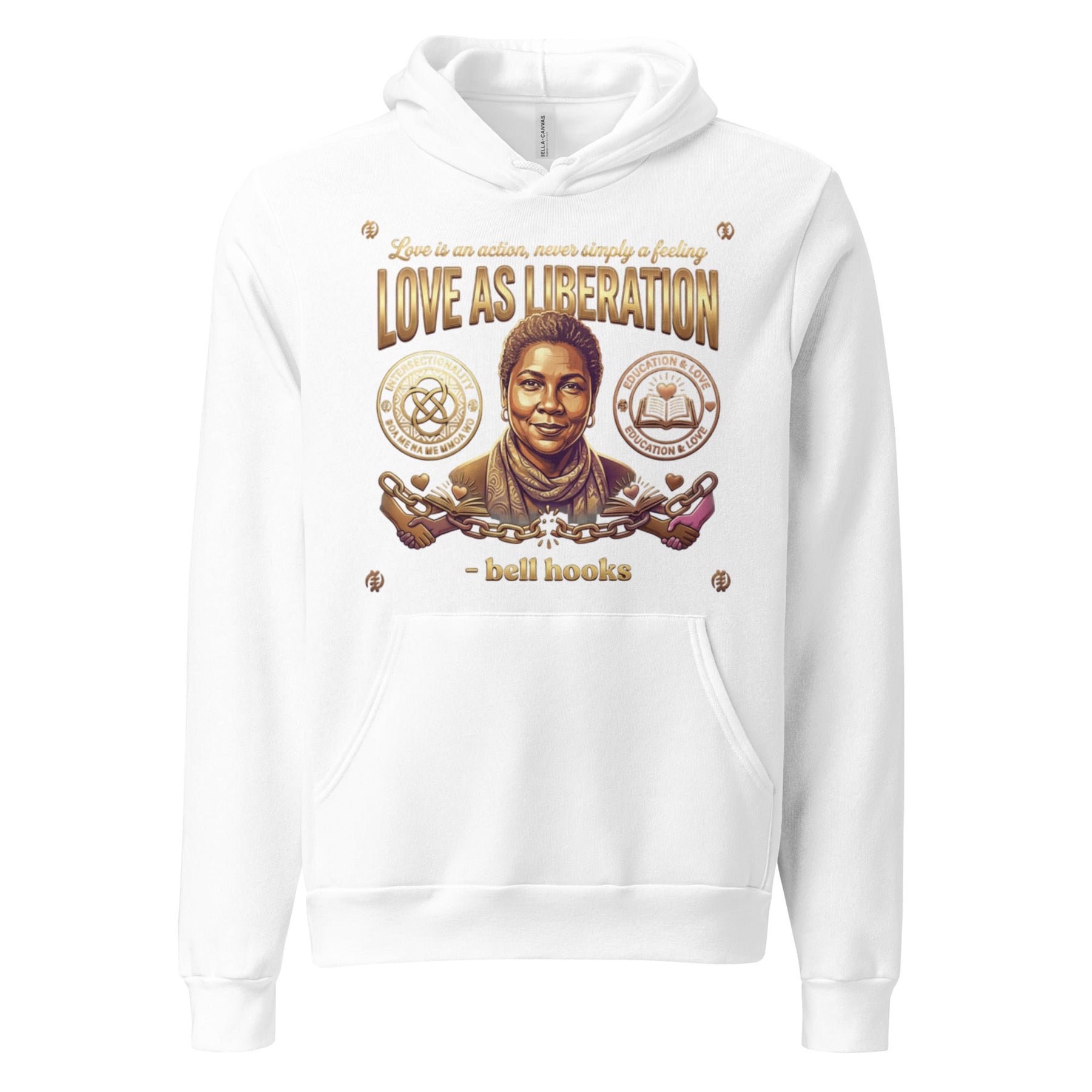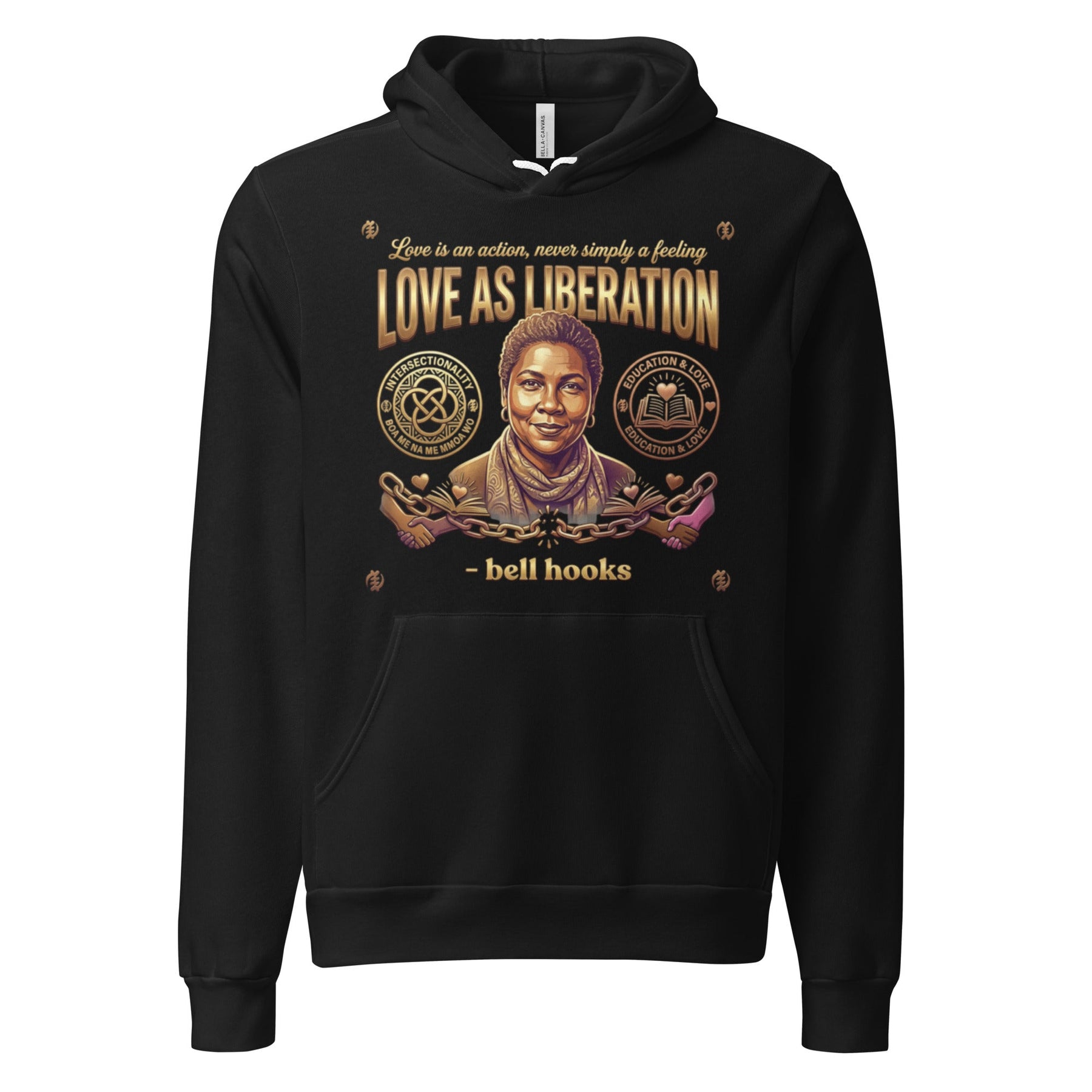 Embrace the transformative teaching of bell hooks, who taught us that "Love is an action, never simply a feeling." This design honors her life's work exploring the intersections of race, gender, capitalism, and love. The interlocking circles and the book with a heart represent her vision of an intersectional feminism rooted in love and community. Wear this as a reminder that love can be a powerful, revolutionary force for liberation.