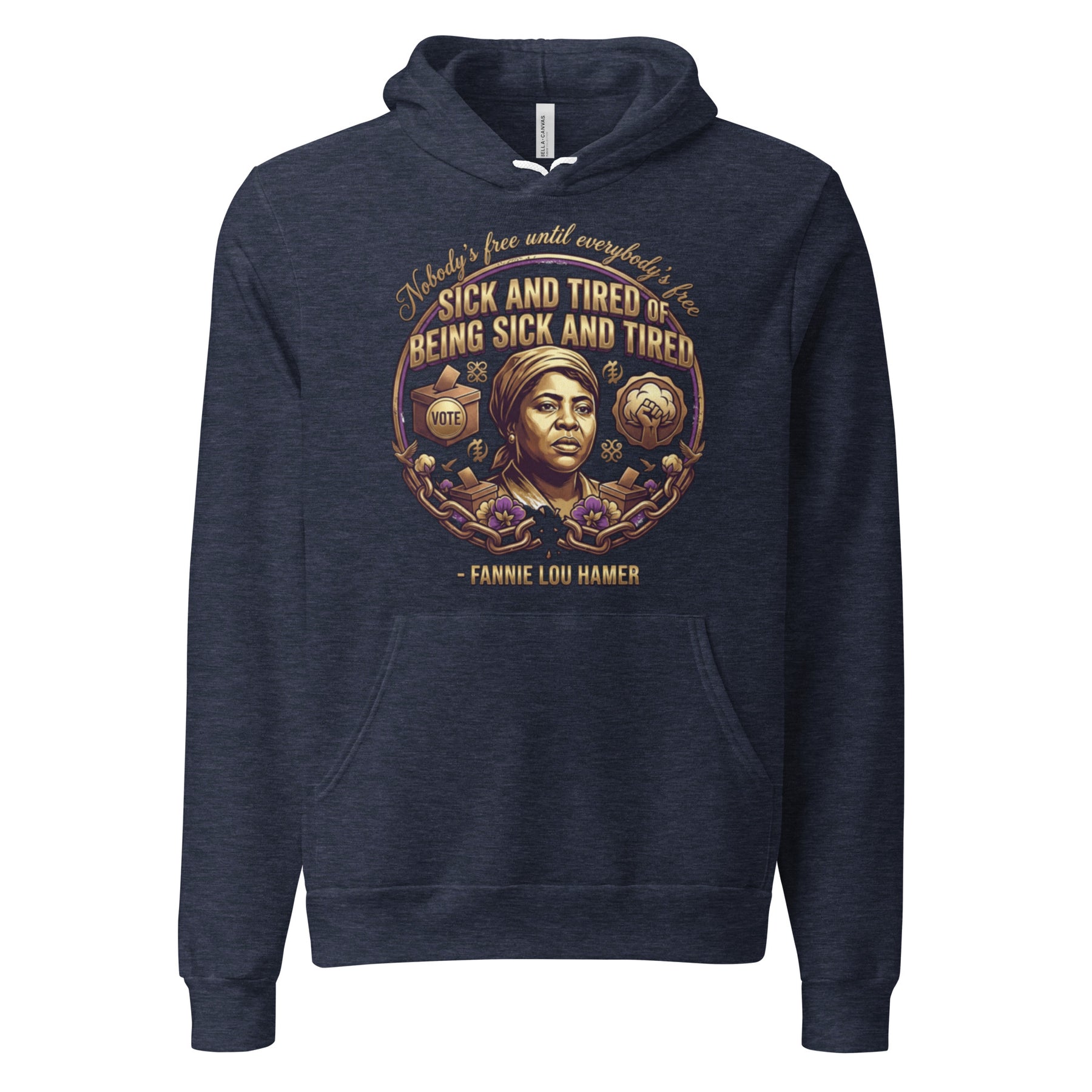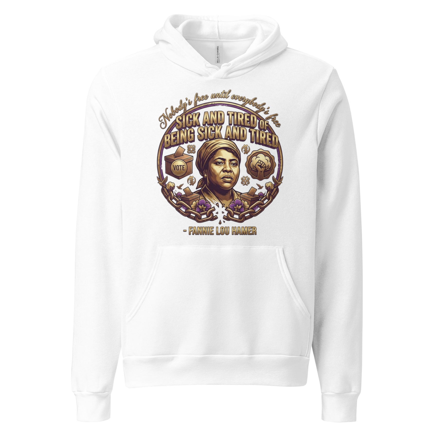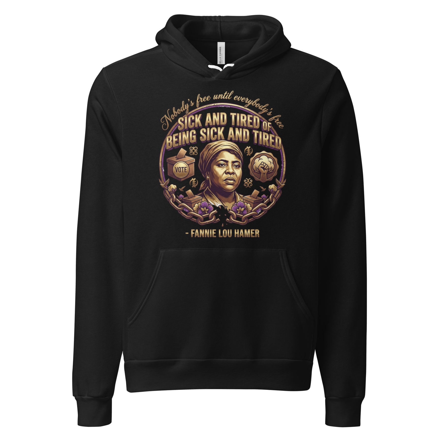 Amplify the voice that shook a nation. This design honors Fannie Lou Hamer, the sharecropper who became a giant of the Civil Rights Movement. Featuring her famous declaration that she was "sick and tired of being sick and tired," this piece captures her righteous indignation and unwavering courage. The ballot box symbolizes her relentless fight for voting rights, while the cotton plant transforming into a fist represents her journey from the cotton fields to the front lines of the movement. Wear this as a tribute to the power of a grassroots voice that refuses to be silenced.