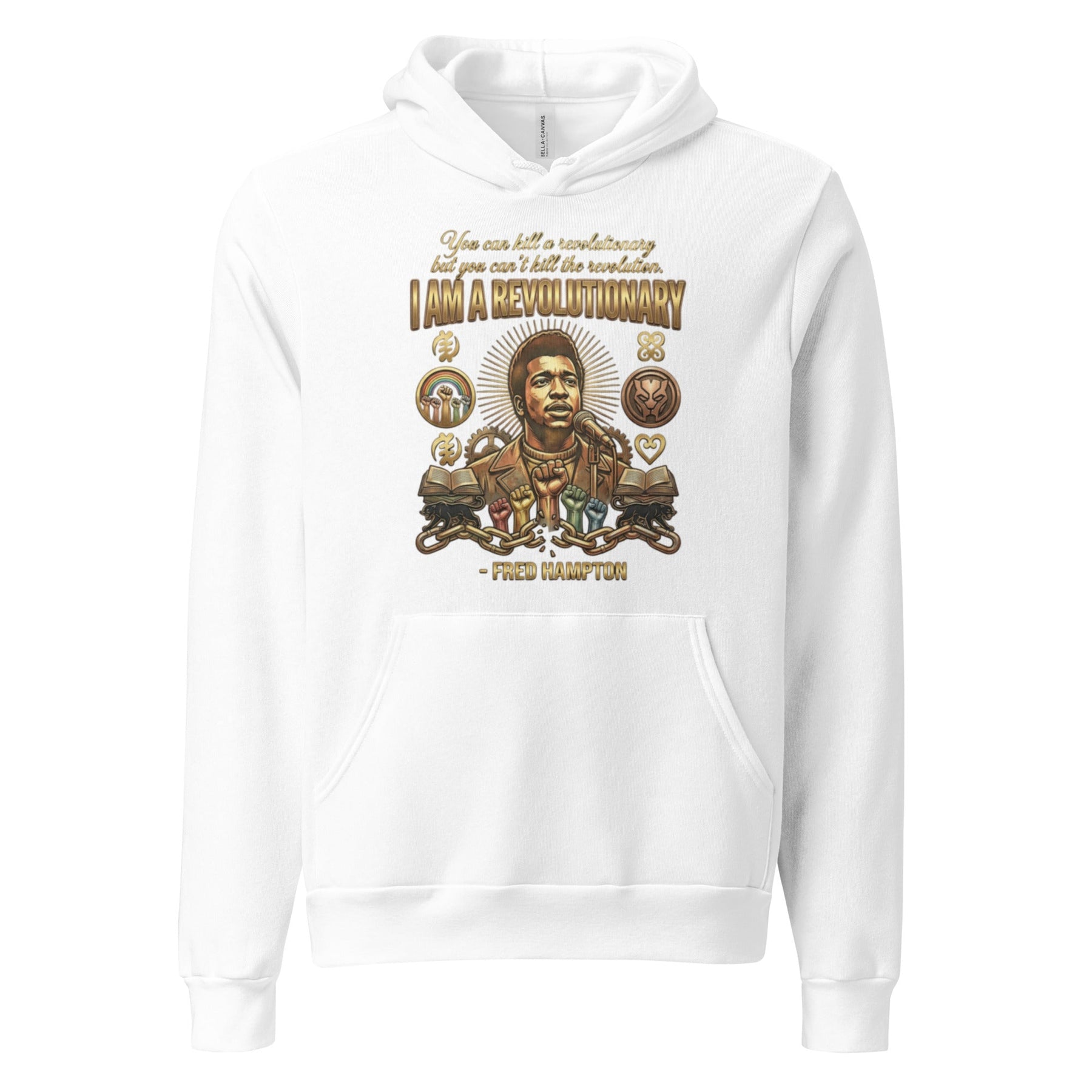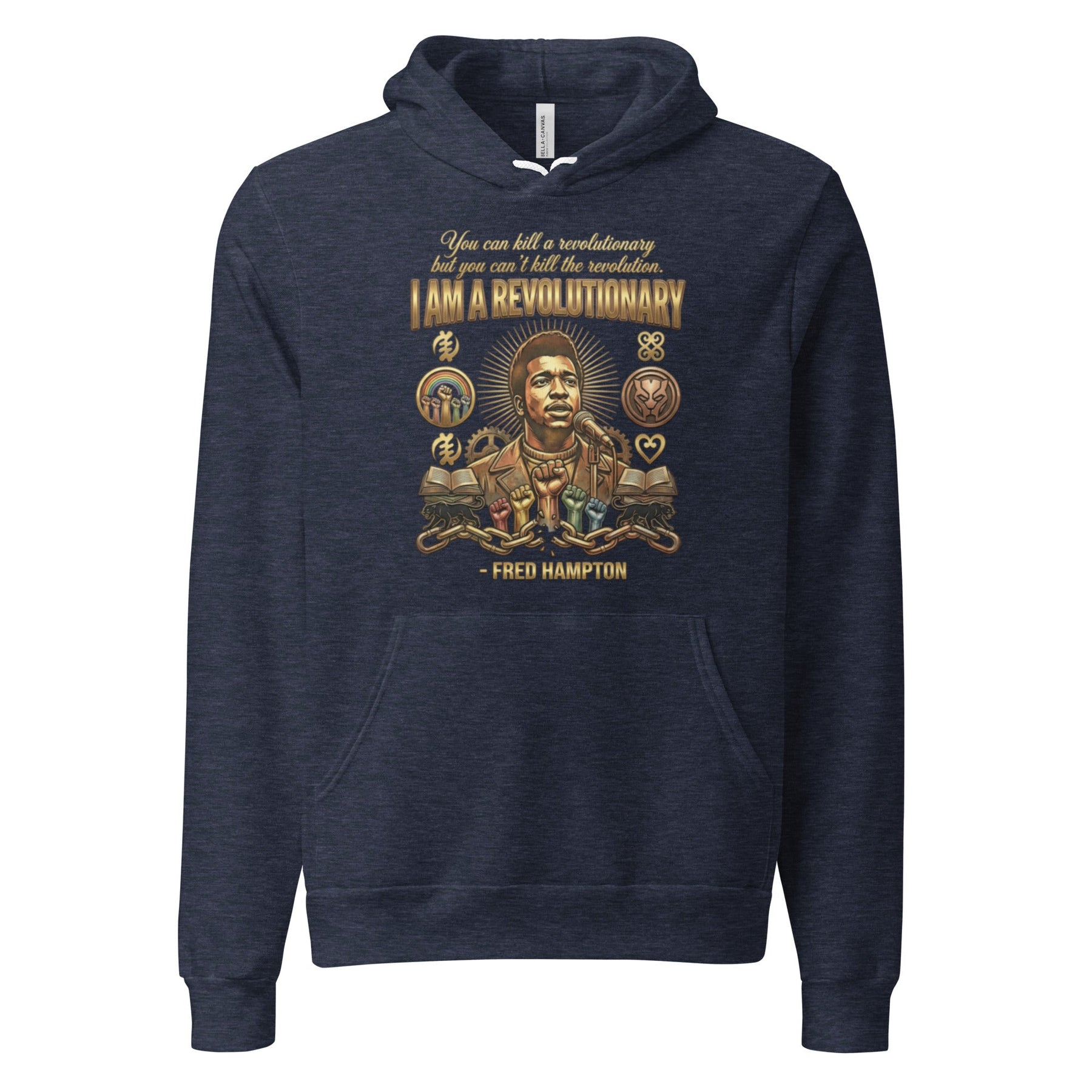 Remember the voice that was silenced but could not be stopped. This design honors Fred Hampton, the charismatic leader of the Black Panther Party's Chicago chapter. Featuring his powerful words, "You can kill a revolutionary, but you can't kill the revolution," this piece celebrates his legacy of coalition-building, represented by the Rainbow Coalition symbol. Wear this in memory of a leader whose revolutionary spirit continues to inspire.