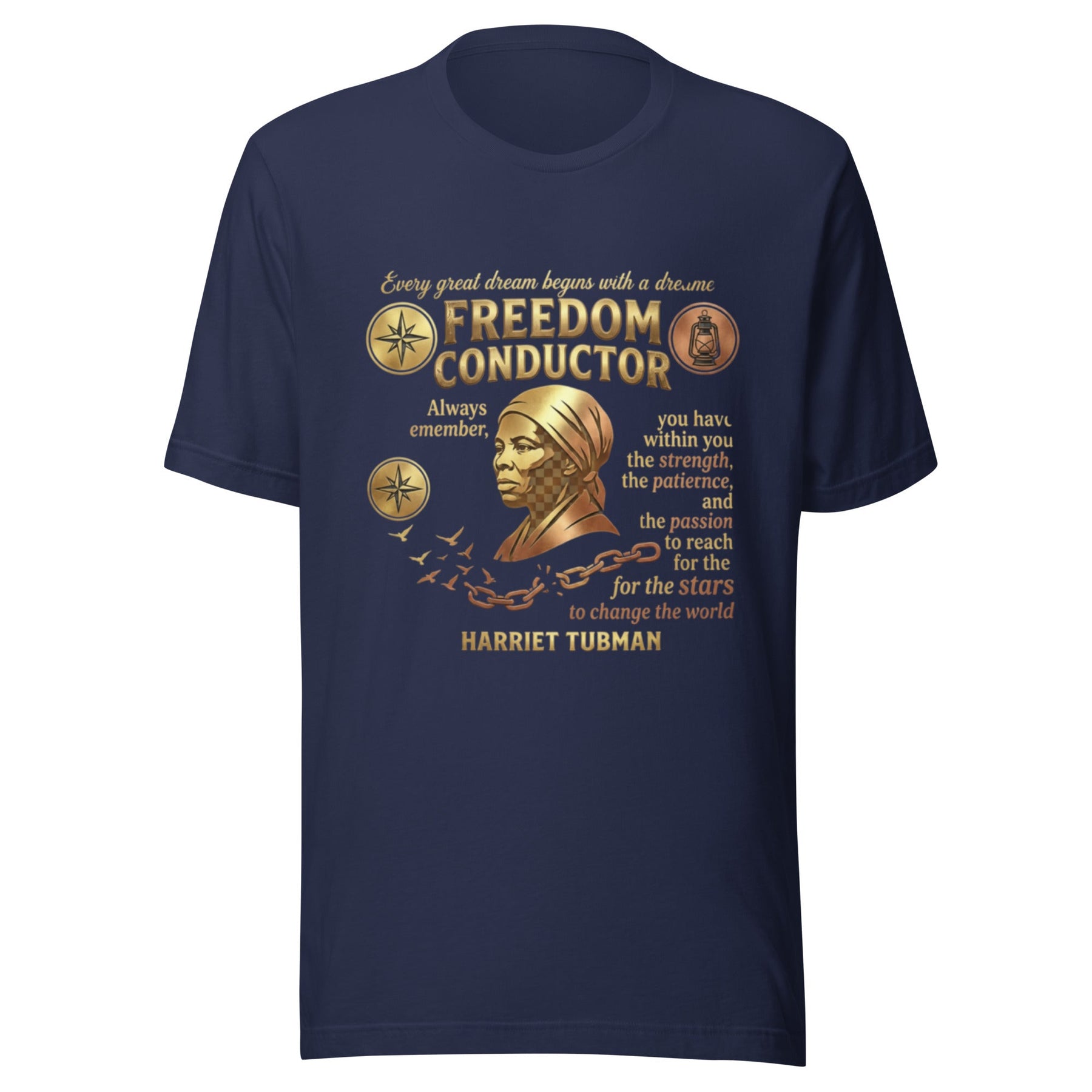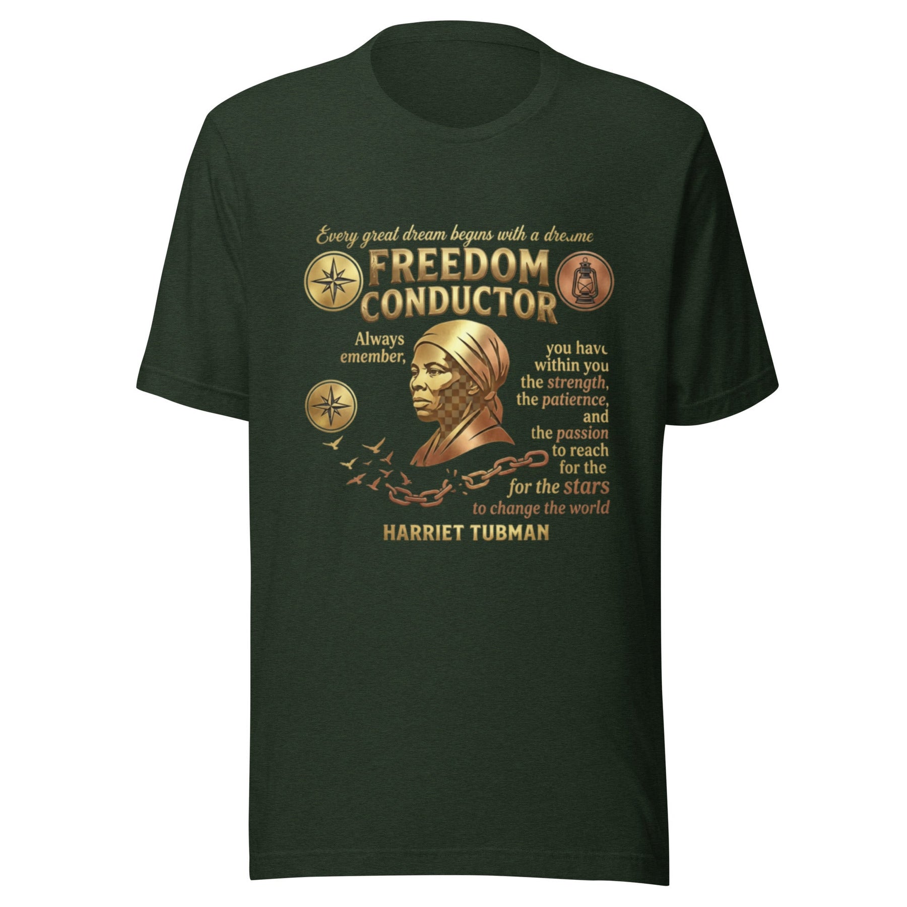 Carry the spirit of the Moses of her people. This design honors Harriet Tubman, the fearless conductor of the Underground Railroad. Featuring her quote, "Every great dream begins with a dreamer," this piece celebrates her unwavering faith and courage. The North Star and railroad lantern guide the way, while broken chains transform into birds following the light to freedom. Wear this as a tribute to the woman who led hundreds from bondage to liberation, one star-lit journey at a time.