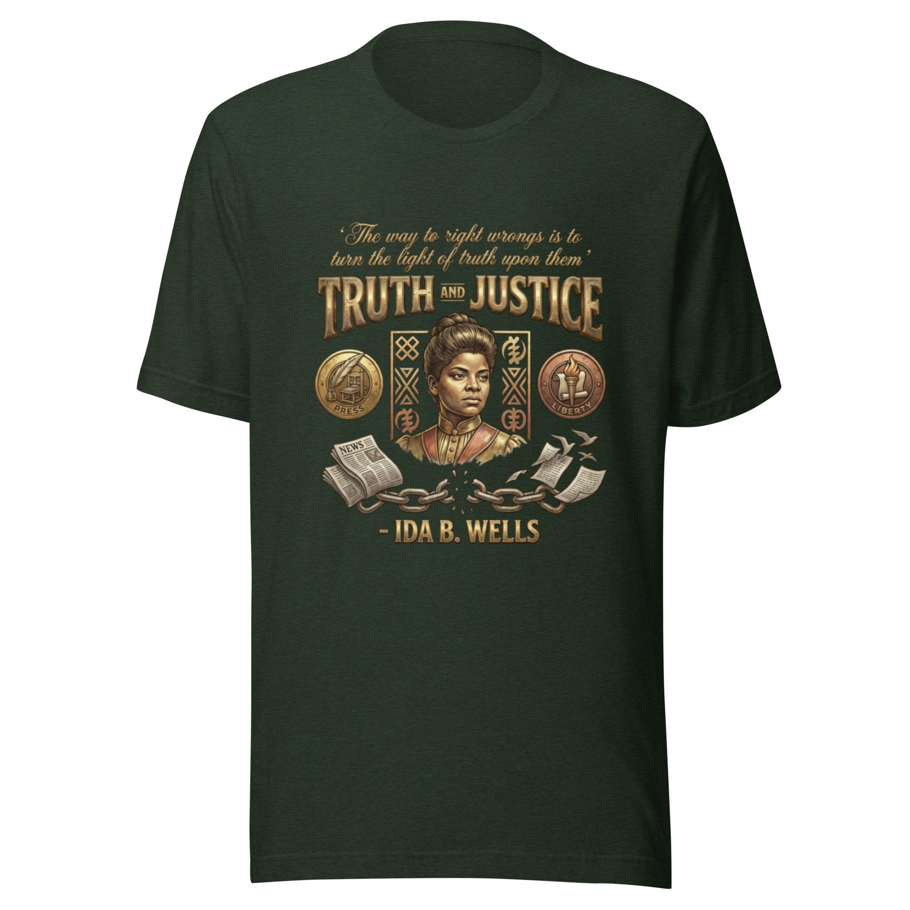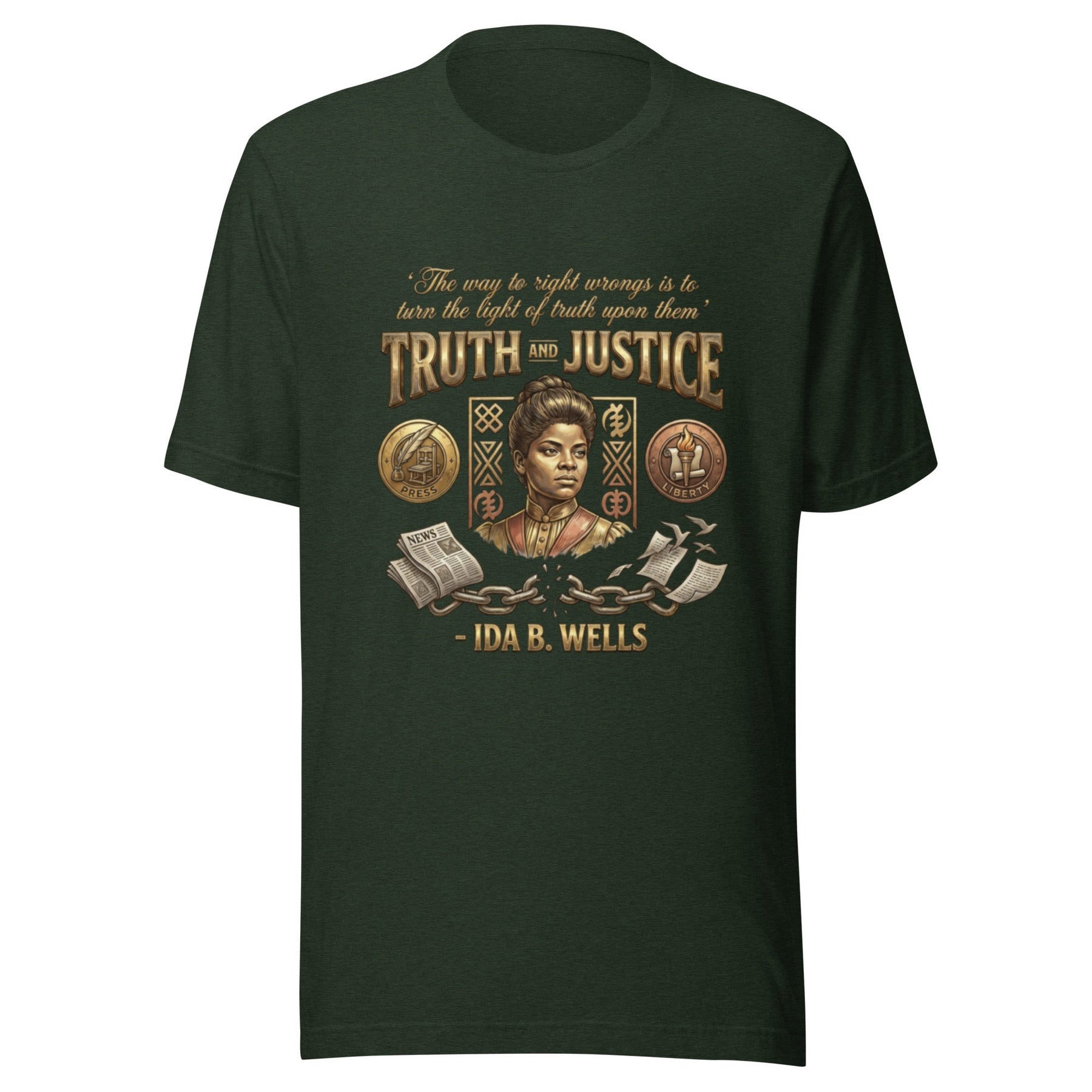 Honor the journalistic courage of Ida B. Wells, the anti-lynching crusader who wielded truth as her weapon. Featuring her belief that "The way to right wrongs is to turn the light of truth upon them," this design celebrates her fearless investigative spirit. The press and the torch of truth symbolize her life's work, while broken chains transform into newspapers flying free. Wear this as a tribute to the power of a free press and the relentless pursuit of justice.
