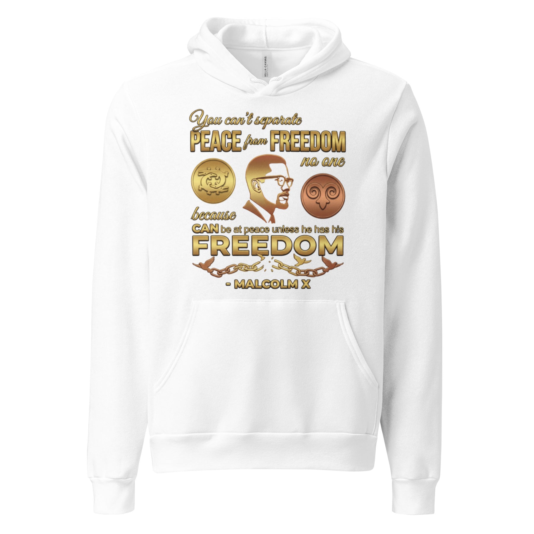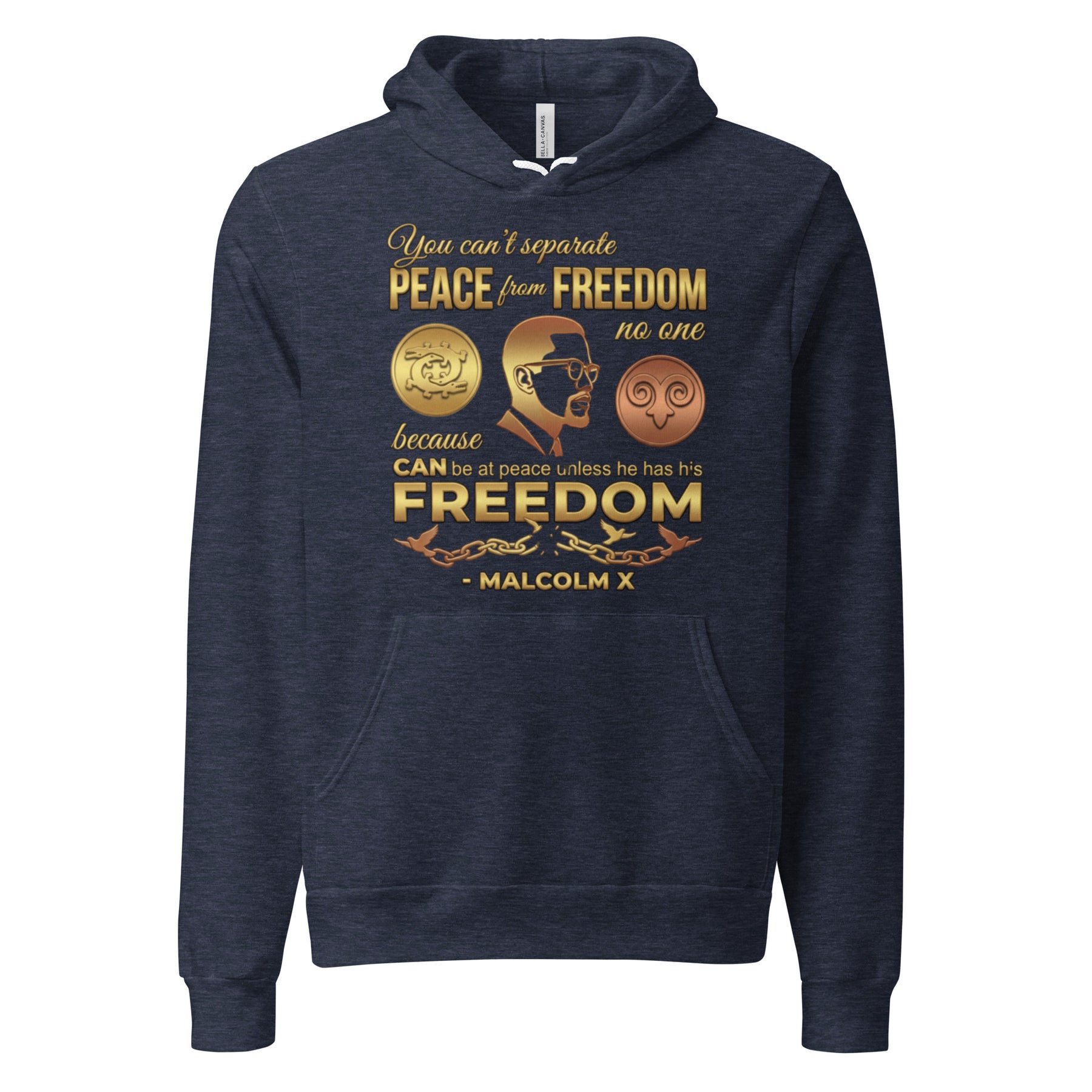 Honor the unyielding voice of Malcolm X with this powerful design. Featuring his iconic quote, "You can't separate peace from freedom because no one can be at peace unless he has his freedom," this piece is a testament to his revolutionary clarity. The design incorporates a silhouette of Malcolm X, Adinkra symbols for unity and strength, and broken chains transforming into birds—a symbol of the journey from bondage to liberation. Wear this as a reminder that true peace is not possible without total freedom.
