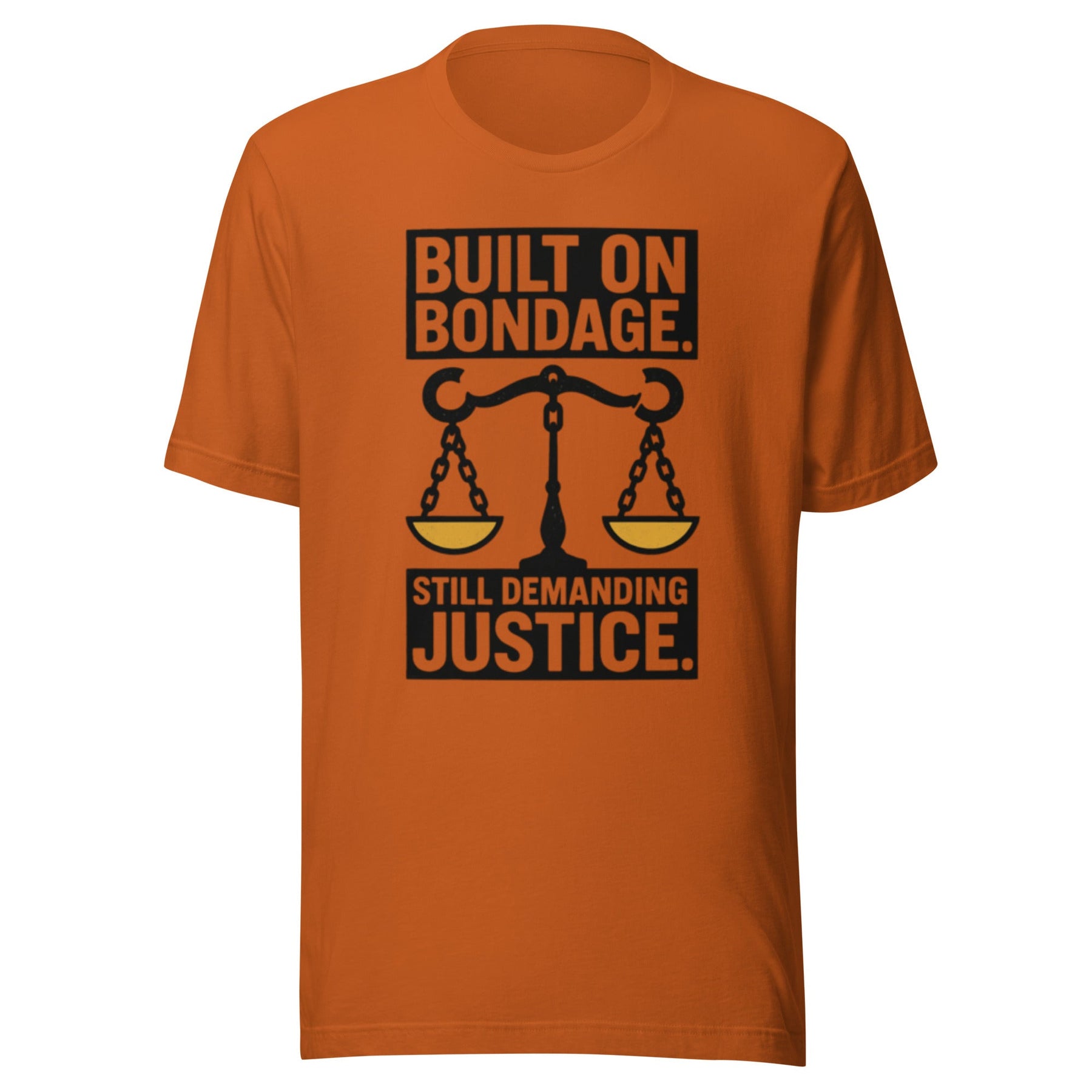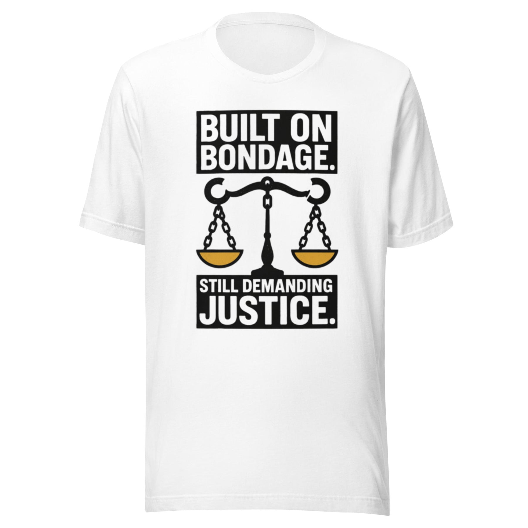 Make a powerful statement with this bold, thought-provoking design that speaks truth to history and demands accountability for the present. Featuring striking typography and the iconic scales of justice rendered in chains, this piece serves as a visual reminder that the fight for equity and justice continues.