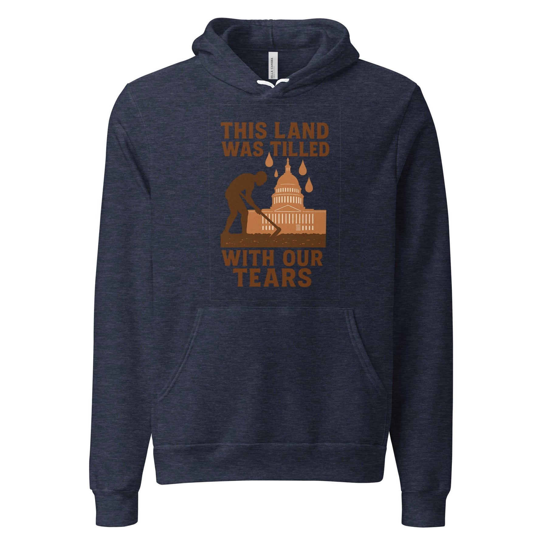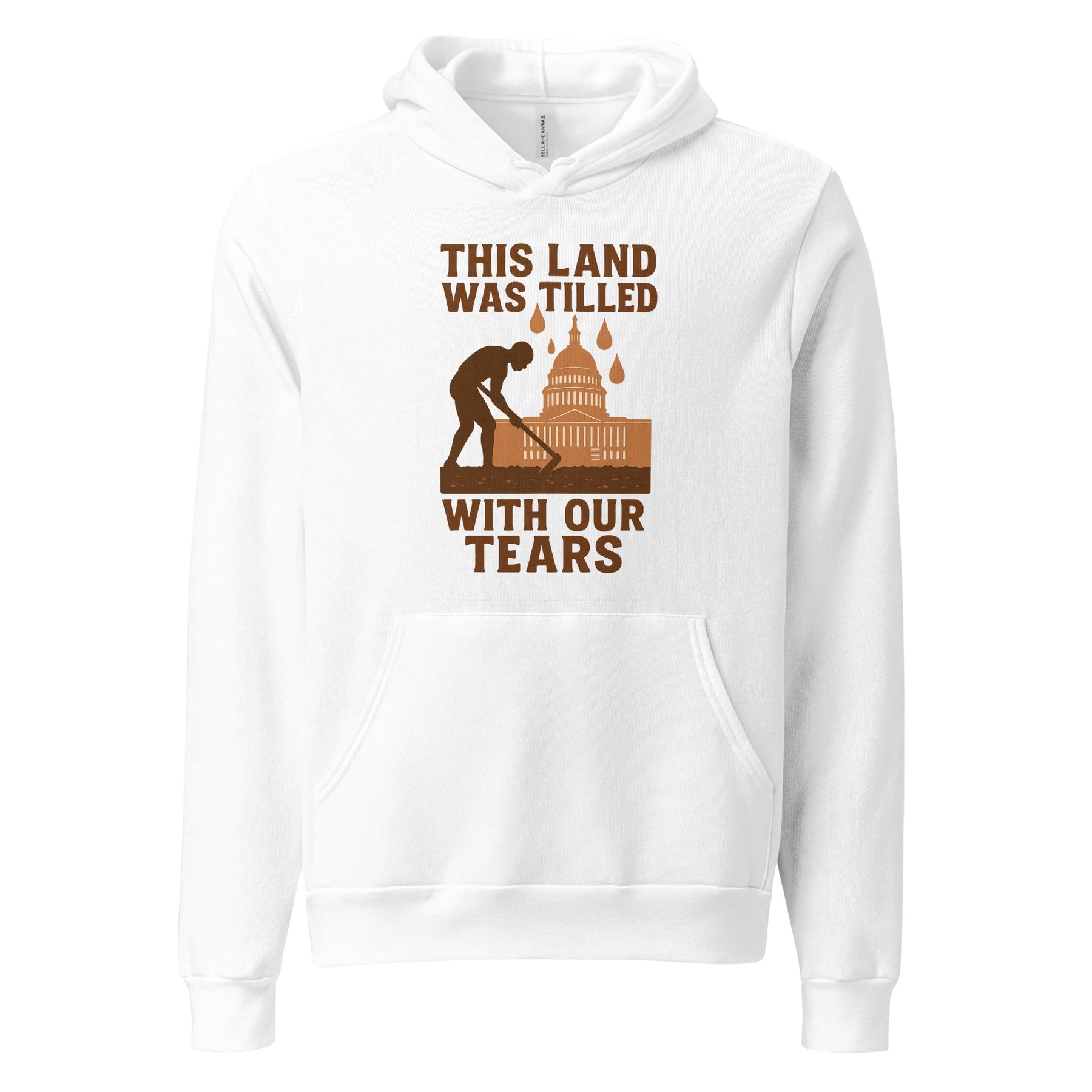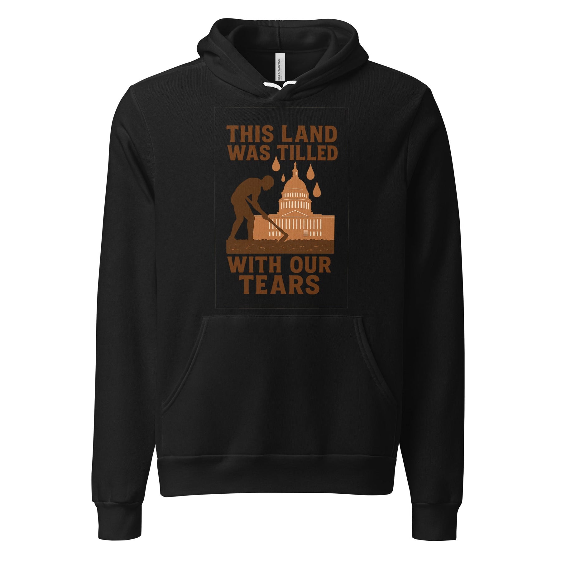 This design features a silhouette of an enslaved person bent over in agricultural labor, with the US Capitol rising from the earth in the background. Golden tears fall from above, symbolizing both the suffering and the sacred nature of their contribution. The quote "This land was tilled with our tears" is a poetic yet devastating truth.