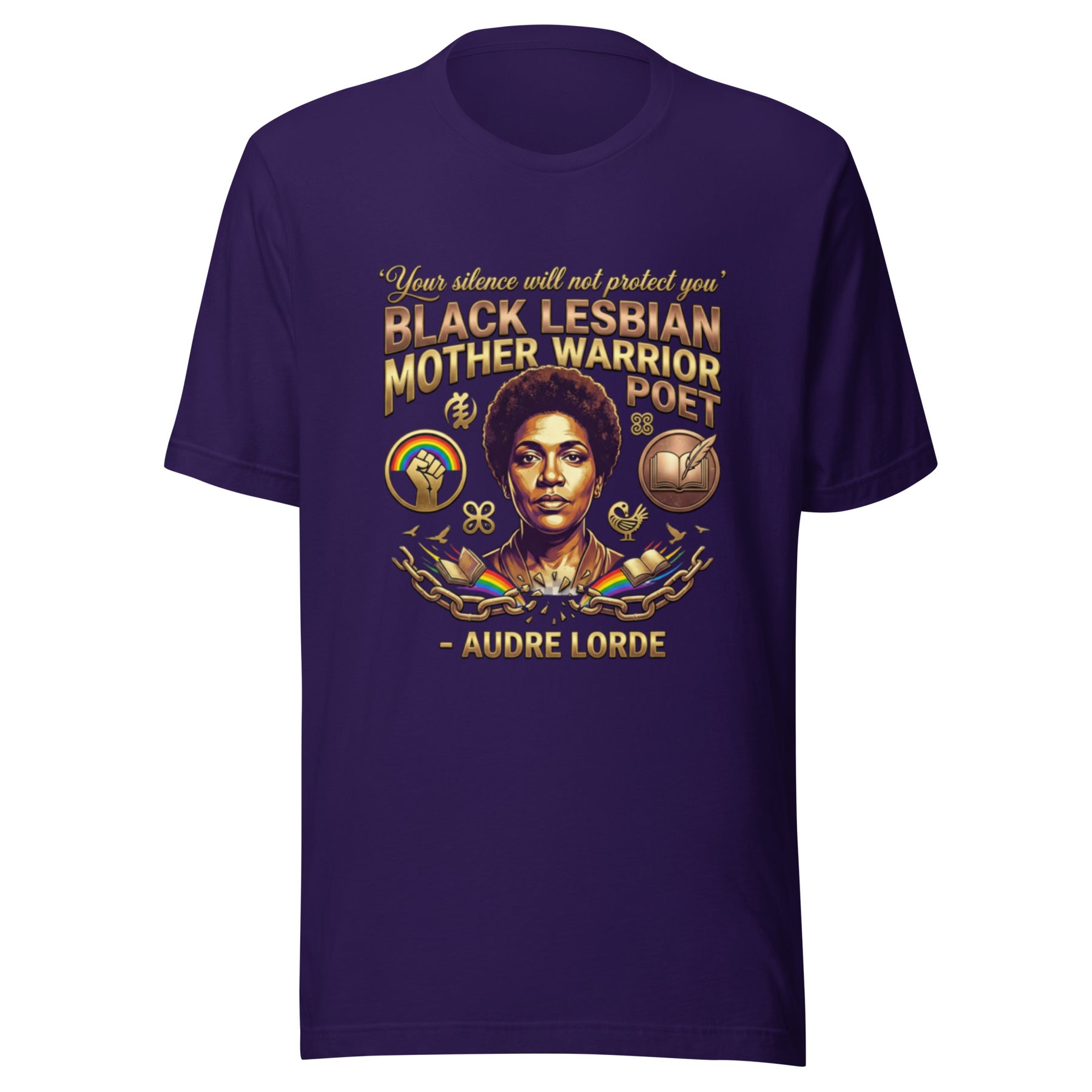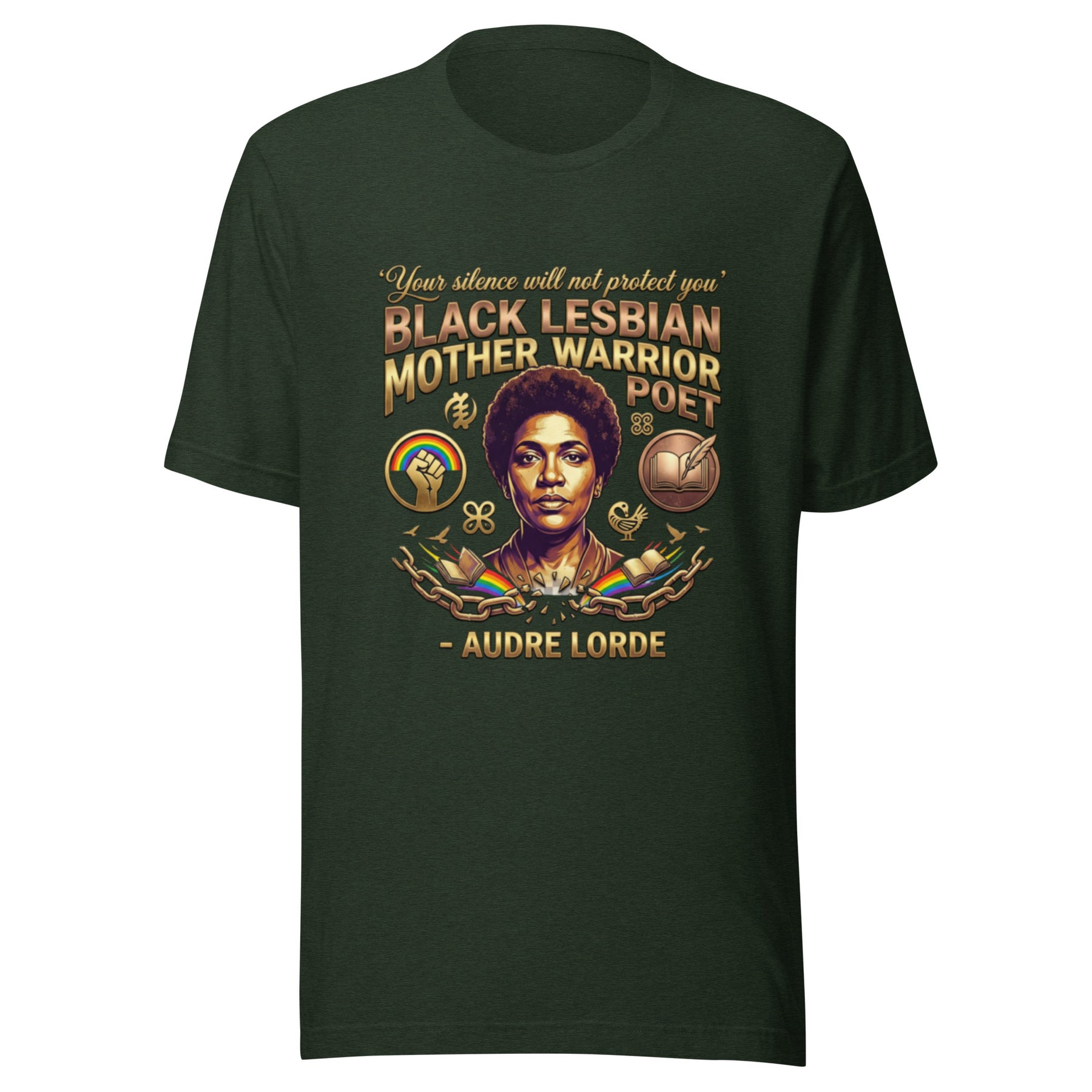 Wear the truth of Audre Lorde, the warrior poet who taught us that "Your silence will not protect you." This design honors her multifaceted identity as a "Black, Lesbian, Mother, Warrior, Poet." The rainbow fist and open book symbolize her foundational work in intersectional feminism, critical theory, and queer studies. This piece is a tribute to her insistence that we live and speak our whole truths.
