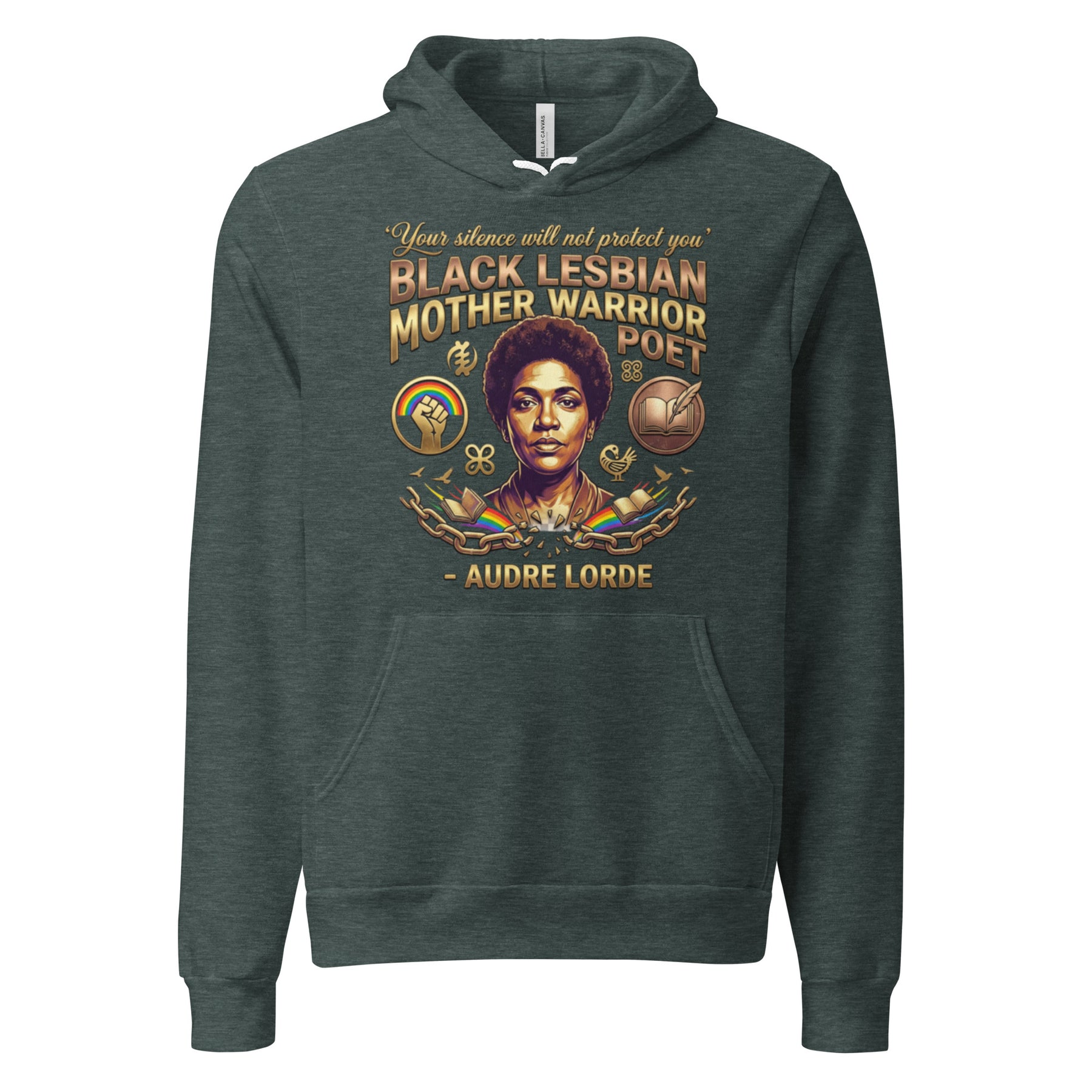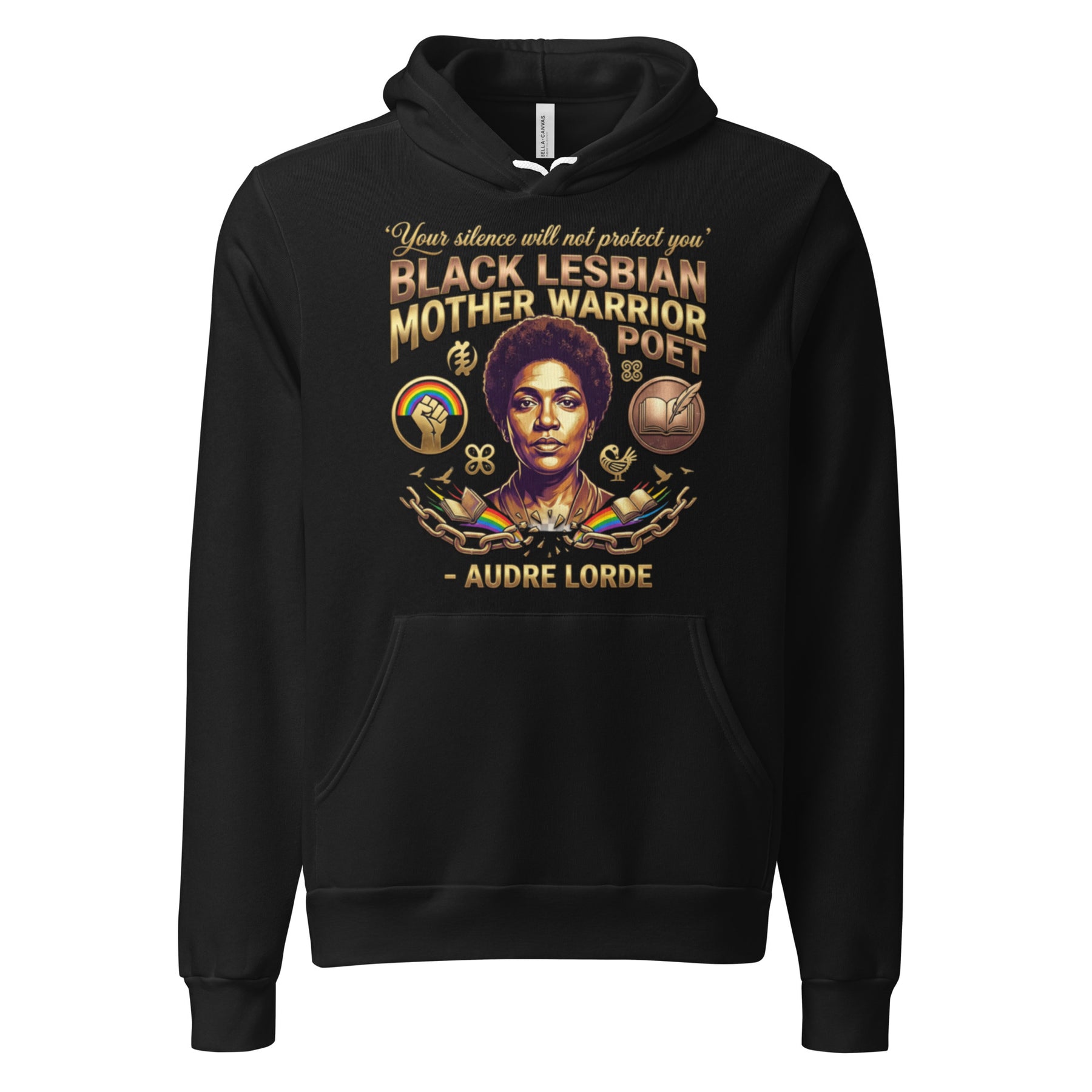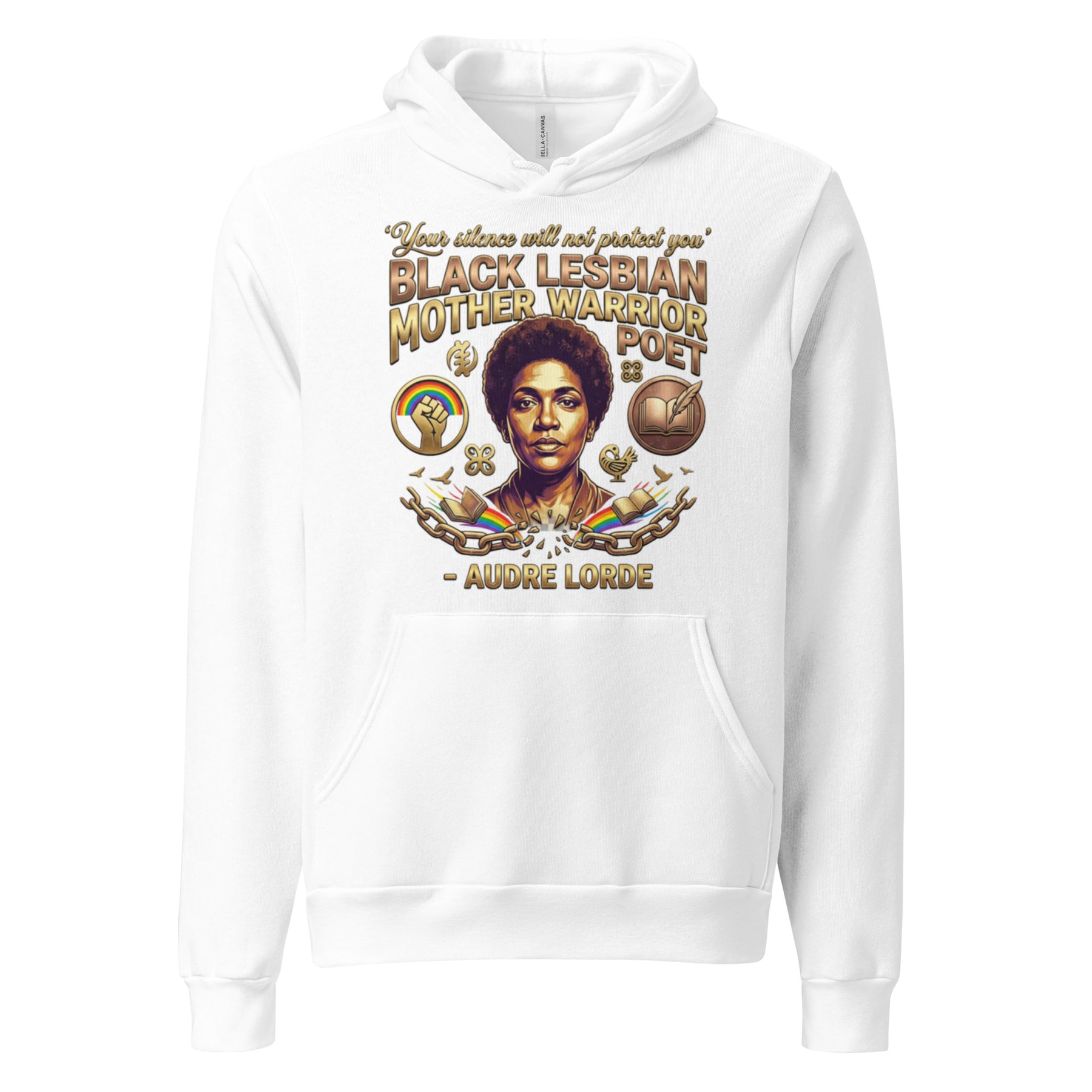 Wear the truth of Audre Lorde, the warrior poet who taught us that "Your silence will not protect you." This design honors her multifaceted identity as a "Black, Lesbian, Mother, Warrior, Poet." The rainbow fist and open book symbolize her foundational work in intersectional feminism, critical theory, and queer studies. This piece is a tribute to her insistence that we live and speak our whole truths.