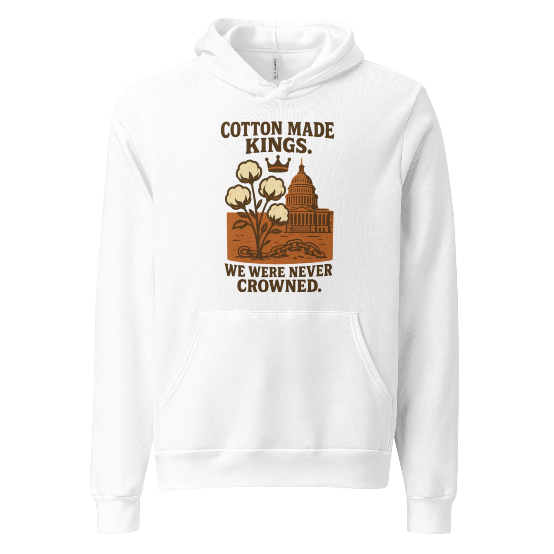 This design features cotton plants in the foreground with a crown floating above the US Capitol in the background, while broken chains lie at the base of the plants. The quote "Cotton made kings. We were never crowned" is a bitter irony: the people who created the wealth were treated as property, not royalty.