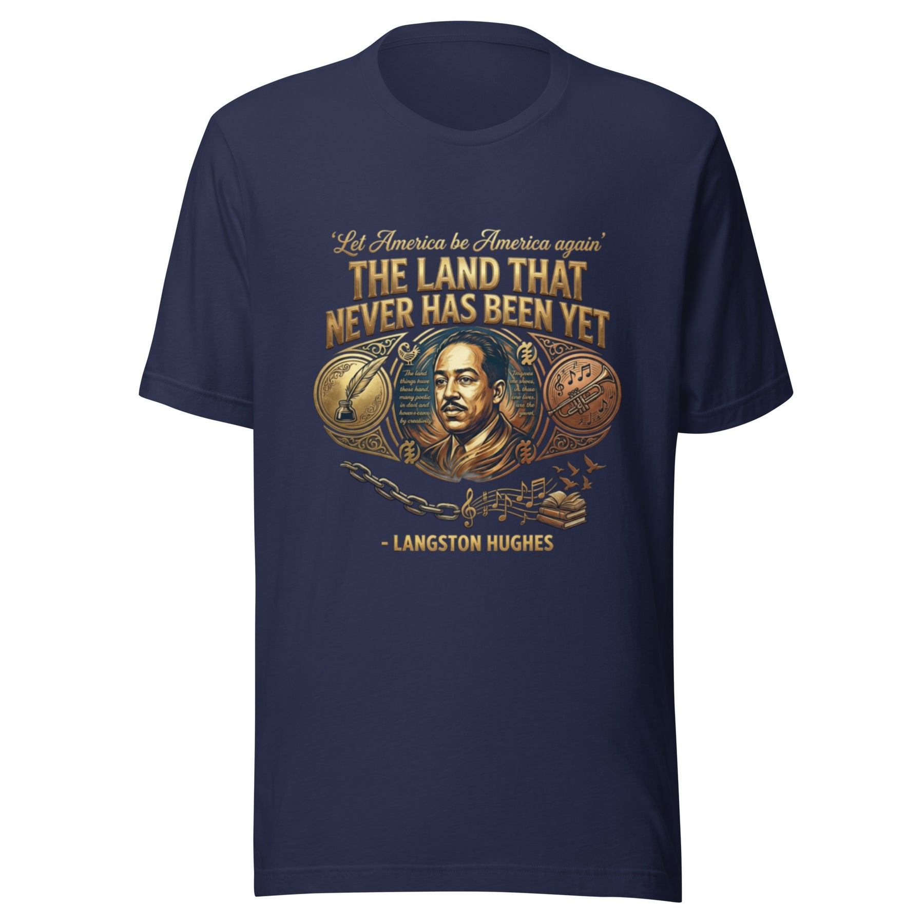 Wear the poetic soul of the Harlem Renaissance. This design honors Langston Hughes and his poignant critique of the American promise, featuring lines from his poem, "Let America be America again—The land that never has been yet—." The quill pen and jazz trumpet represent the creative fire of his era, while broken chains transform into musical notes and books. This piece is a tribute to the dreamers who dare to imagine a better world into being.